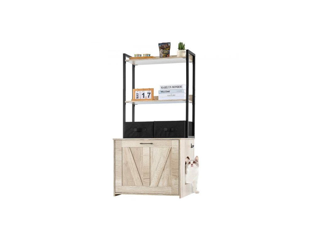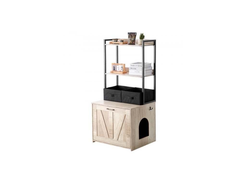 skříňka na kočičí toaletu, skrytý nábytek na kočičí toaletu se 2 úložnými policemi a 2 koši, dřevěná kočičí toaleta do interiéru, skříňka na kočičí toaletu se hodí do většiny kočičích toalet, 23,6"D x 19,7"Š x 50"V, přírodní