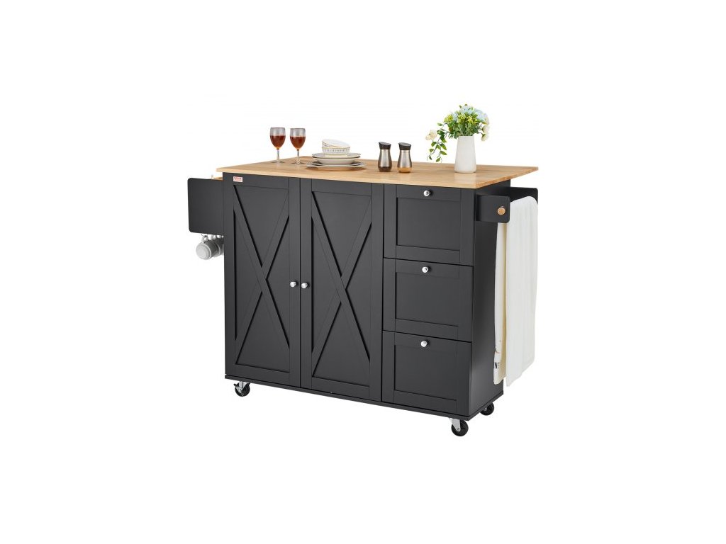 Kuchyňský ostrůvek , mobilní vozíky s dřevěnou deskou 56" s úložnou skříňkou, pojízdným stolem s výklopnou deskou, věšákem na koření, věšákem na ručníky, nastavitelnou policí, zásuvkou a háčky, přenosné ostrůvky na kolečkách, černý