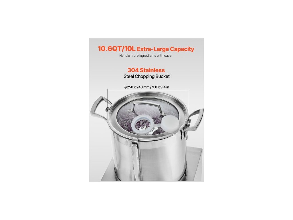 Materiál nožů: 420J2, Rychlost: 1400 ot./min, Kapacita: 10,6 QT / 10 l, Hluk: <= 75 db, Materiál sekací nádoby: Nerezová ocel 304, Číslo modelu položky: SC-7310, Materiál pláště hlavního tělesa: Nerezová ocel 201, Čistá hmotnost: 68,4 lbs / 31,0 kg, Příkon: 1100 W, Rozměry výrobku: 14,2 x 14 x 22,2 palce / 360 x 355 x 565 mm