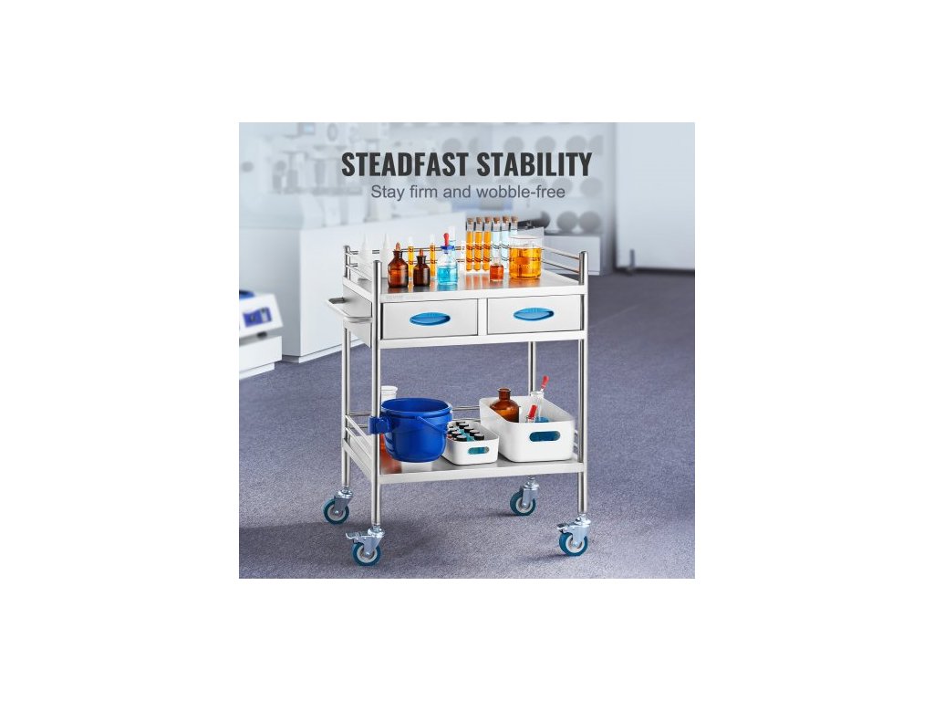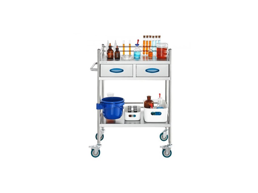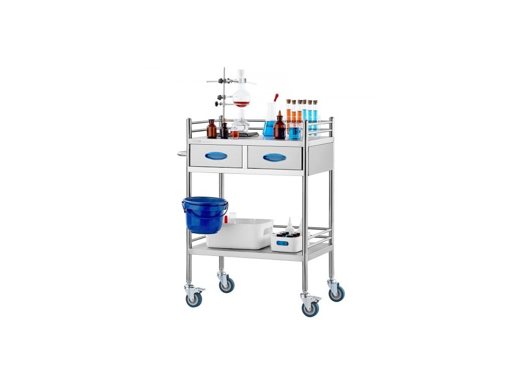Laboratorní servírovací vozík , 2vrstvý nerezový pojízdný vozík, lékařský vozík se dvěma zásuvkami, zubní vozík s uzamykatelnými kolečky a kbelíkem, pro laboratoře, nemocnice a zubní použití
