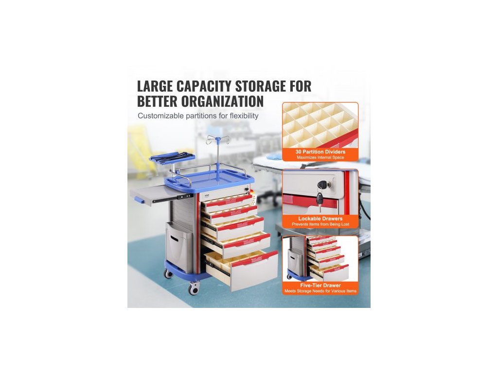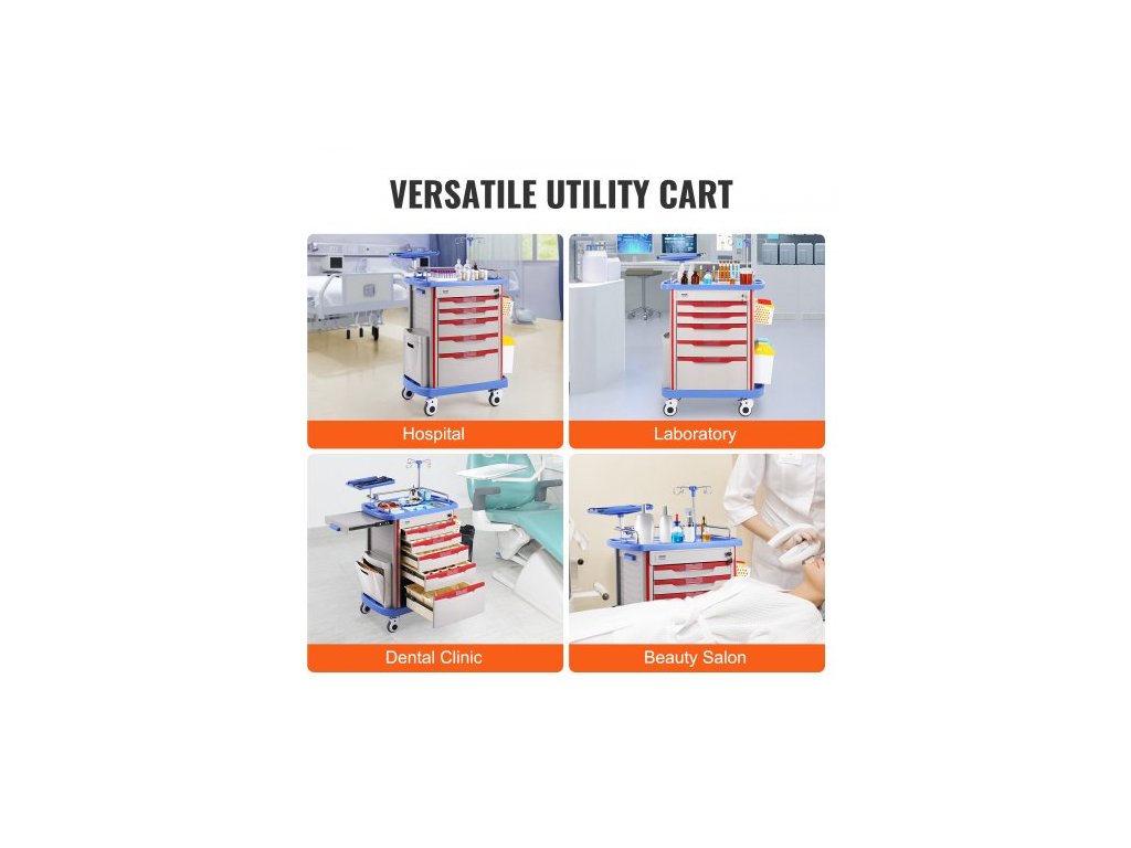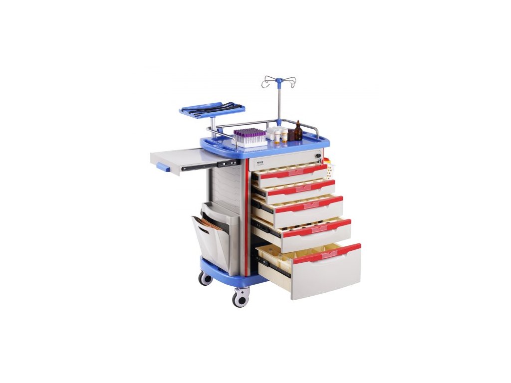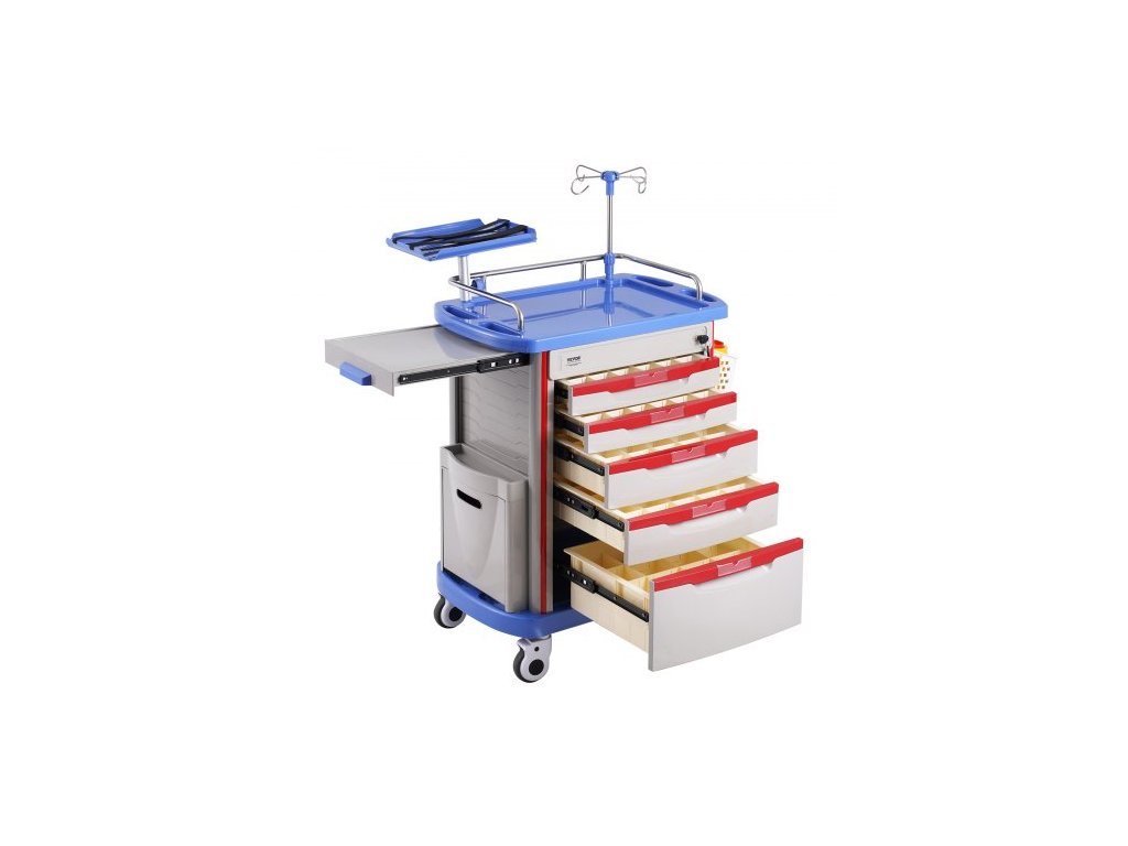 Laboratorní vozíky s 5 úrovněmi, Laboratorní vozík s 5 zásuvkami a 4 tichými kolečky, Mobilní lékařský vozík z PP materiálu, Laboratorní vozík na kolečkách se 2 odpadkovými koši pro laboratoř, kliniku, nemocnici, salon, Modrý