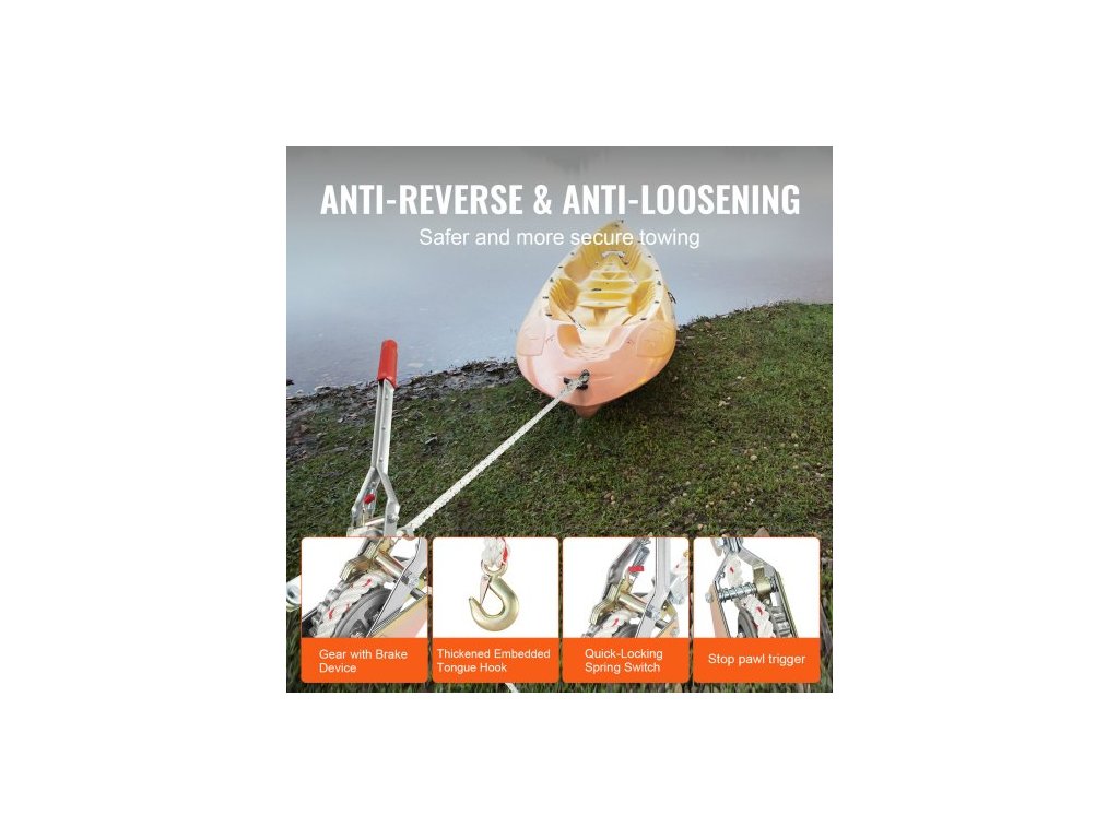 Lanový stahovák , tažná síla 3/4 tuny (750 kg), s lanem o průměru 30,48 m o průměru 1,52 cm, 2 háky, naviják s přiloženým mechanismem, ráčna pro těžký provoz, silný stahovák pro přesun lodí, zajištění předmětů a přepravu klád