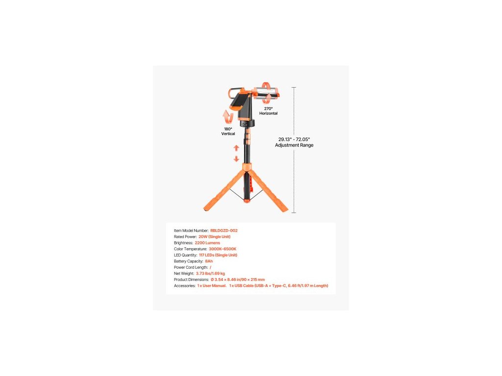 Délka napájecího kabelu: /, Počet LED: 117 LED (jedna jednotka), Kapacita baterie: 8 Ah, Teplota barev: 3000K–6500K, Jas: 2200 lumenů, Číslo modelu položky: RBLDGZD-002, Jmenovitý výkon: 20W (jedna jednotka), Rozměry výrobku: O 3,54 x 8,46 palce/90 x 215 mm, Čistá hmotnost: 3,73 1,69 kg