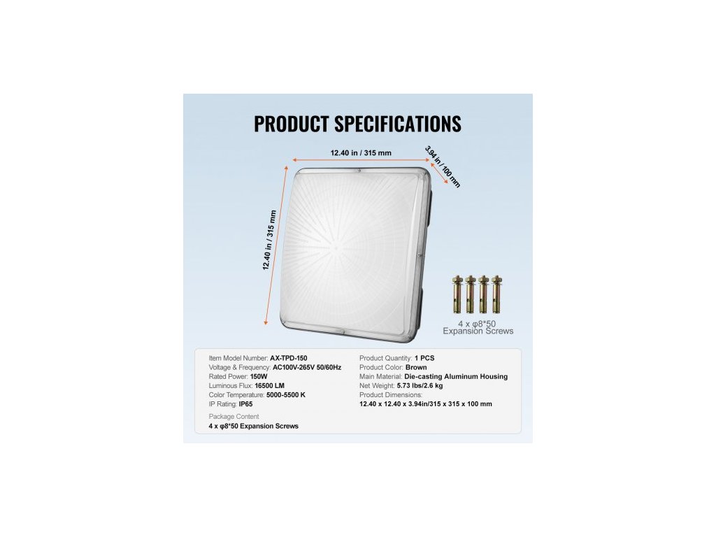 Množství produktu: 1 ks,Teplota chromatičnosti 5000-5500 K:,Stupeň krytí IP: IP65,Barva produktu: Hnědá,Číslo modelu produktu: AX-TPD-150,Jmenovitý výkon: 150W,Napětí a frekvence: AC100V-265V, 50/60Hz,Rozměry produktu: 12,4 x 12,4 x 3,94 palce/315 x 315 x 100 mm,Čistá hmotnost: 5,73 2,6 kg, Hlavní materiál: Tlakové lití hliníku, Světelný tok: 16500 lm