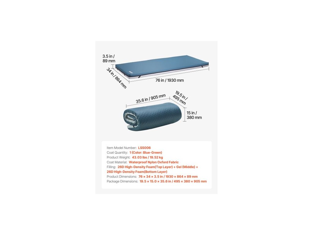 Materiál potahu: Voděodolná nylonová oxfordská tkanina, Nosnost: 136 kg, Rozměry balení: 495 x 380 x 905 mm, Číslo modelu položky: LSS006, Hmotnost výrobku: 19,52 kg, Výplň: Pěna 26D (vrchní vrstva) + Gel (střední) + pěna 26D (spodní vrstva),Rozměry produktu: 76 x 34 x 3,5 palce / 1930 x 864 x 89 mm,Množství nátěrů: 1 (Barva: modrozelená)