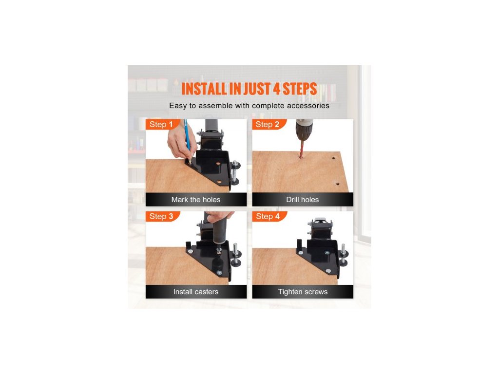 Vhodná tloušťka desky: 12,7–38,1 mm, Nosnost: 181,4 kg, Nastavitelná minimální velikost: 241,3 x 241,3 mm, Číslo modelu položky: GZB88096, Průměr směrových koleček: 76 mm, Hmotnost výrobku: 5,3 kg kg, Materiál: Uhlíková ocel Q235, Průměr otočného kola: 2,5" / 63 mm