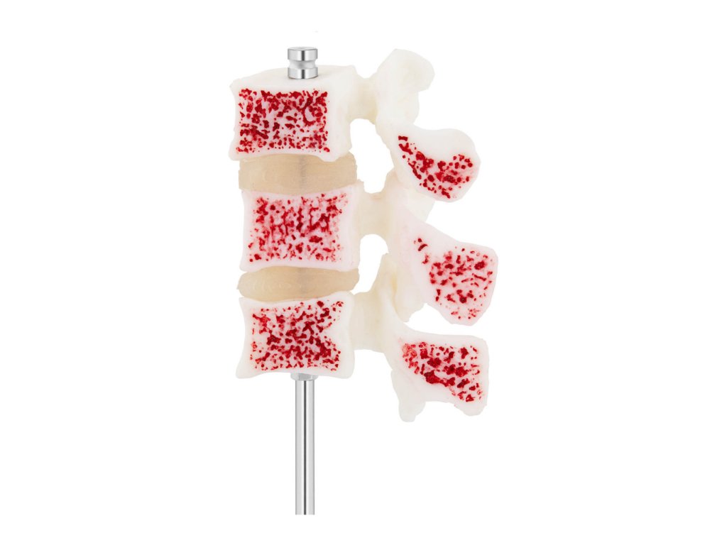Kolorovaný model zobrazuje průběh onemocnění osteoporózou na příkladě třetího, čtvrtého a pátého bederního obratle. Jednotlivé obratle je možné z modelu vyjímat a lépe je prozkoumat. Obratle ukazují velice názorným způsobem slabé až silné příznaky osteoporózy. Anatomický model je umístěn na stabilním a elegantním stojanu, který bezpečným způsobem nese bederní obratel. Na tomto modelu lze velice dobře a srozumitelně ukázat onemocnění osteoporózou, a proto by tento produkt neměl rozhodně chybět v žádné ortopedické ordinaci!