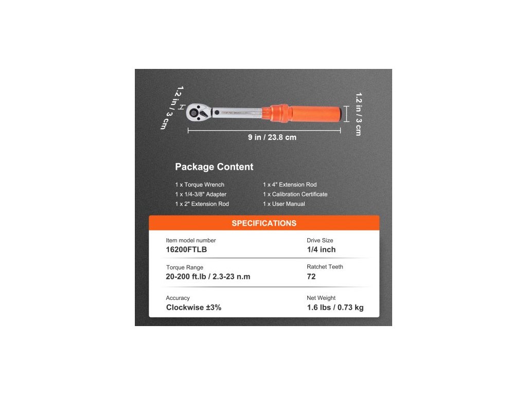 Počet zubů ráčny: 72,Přesnost: Ve směru/proti směru hodinových ručiček ±3 %,Číslo modelu položky: 16200INLB,Čistá hmotnost: 1,6 lb / 0,73 kg,Velikost pohonu: 1/4 palce,Rozsah točivého momentu: 20–200 in.lb / 2,3–23 Nm,Rozměry výrobku: 9 × 1,2 × 1,2 palce / 23,8 × 3 × 3 cm,Rozměry balení: 10,8 × 4,5 × 2,4 palce / 27,5 × 11,5 × 6 cm