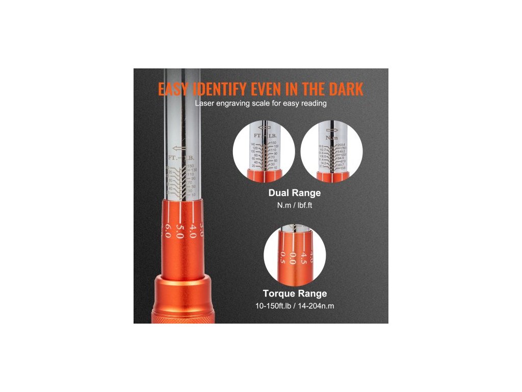 Momentový klíč , 1,3 cm upínací klika, 10–150 ft.lb/14–204 Nm, sada nastavitelných obousměrných momentových klíčů, mechanické stupnice s dvojitým rozsahem, sada momentových klíčů s adaptéry a prodlužovací tyčí