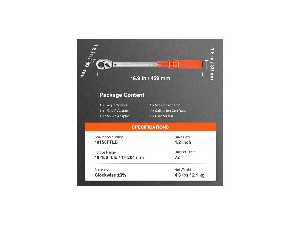 Počet zubů ráčny: 72,Přesnost: Ve směru/proti směru hodinových ručiček ±3 %,Číslo modelu položky: 18150FTLB,Čistá hmotnost: 2,1 kg,Velikost pohonu: 1/2 palce,Rozsah točivého momentu: 14–204 nm,Rozměry výrobku: 43 × 4 × 4 cm,Rozměry balení: 55,5 × 12,5 × 7,5 cm