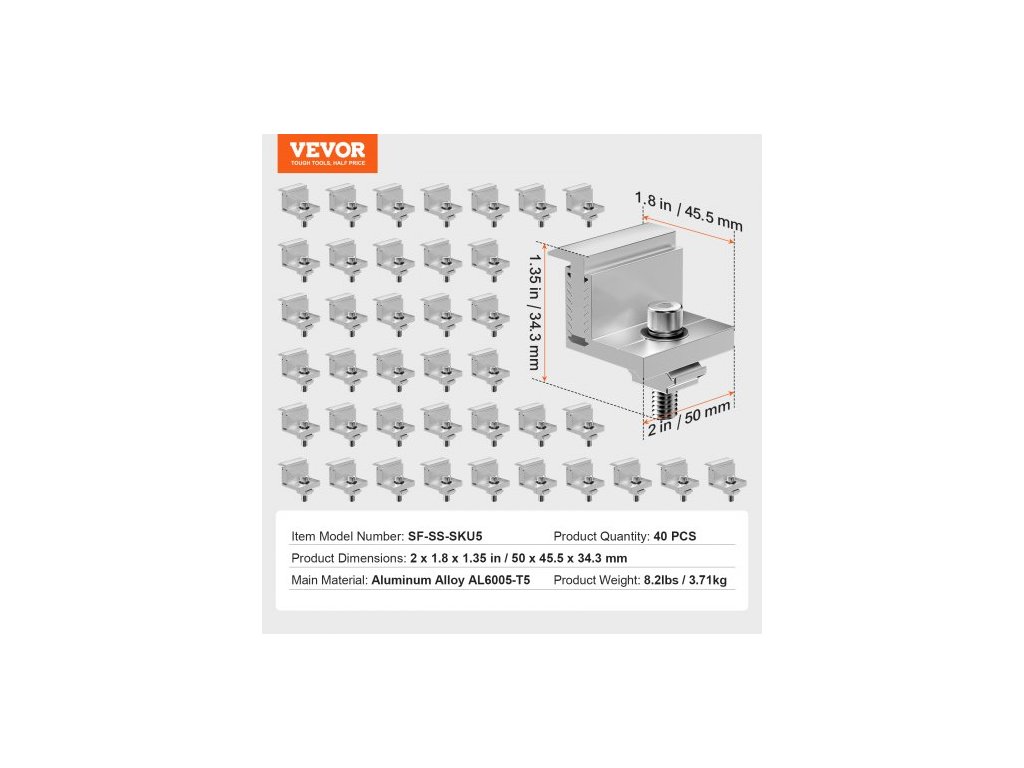 Množství produktu: 40 ks,Číslo modelu položky: SF-SS-SKU5,Hmotnost produktu: 8,2 lbs / 3,71 kg,Rozměry produktu: 2 x 1,8 x 1,35 palce / 50 x 45,5 x 34,3 mm,Hlavní materiál: Hliníková slitina AL6005-T5