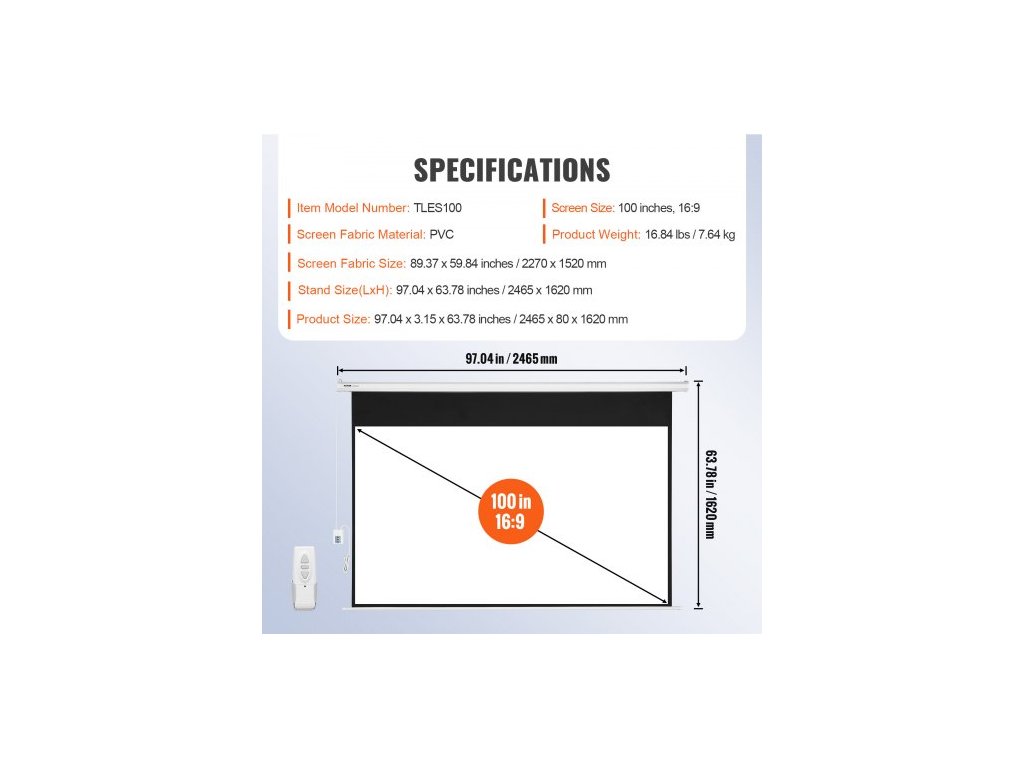 Velikost plátna: 100 palců, 16:9,Číslo modelu: TLES100,Hmotnost výrobku: 16,84 lbs / 7,64 kg,Rozměry látky plátna: 89,37 x 59,84 palců / 2270 x 1520 mm,Rozměry stojanu:Délka x výška: 97,04 x 63,78 palců / 2465 x 1620 mm,Materiál látky plátna: PVC,Rozměry výrobku: 97,04 x 3,15 x 63,78 palce / 2465 x 80 x 1620 mm