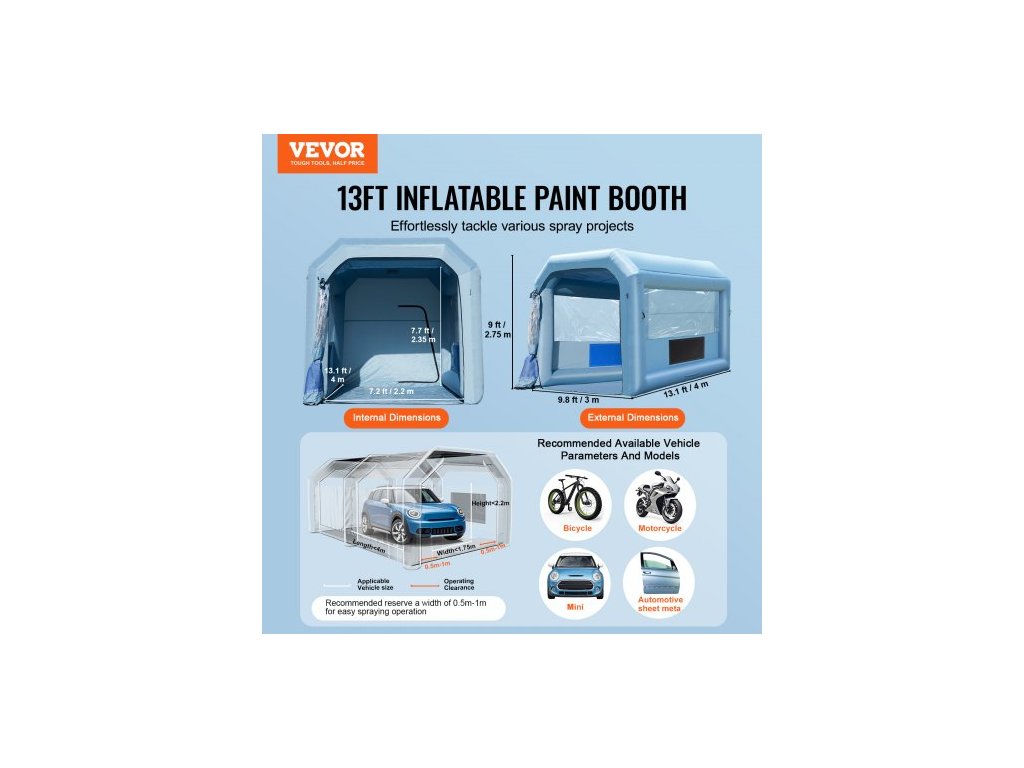 Nafukovací lakovací kabina , 13,1 x 9,8 x 9 stop/4 x 3 x 2,7 m, s výkonným ventilátorem 750 W a systémem vzduchového filtru, přenosná lakovací kabina pro motocykly, jízdní kola a lakování autodílů