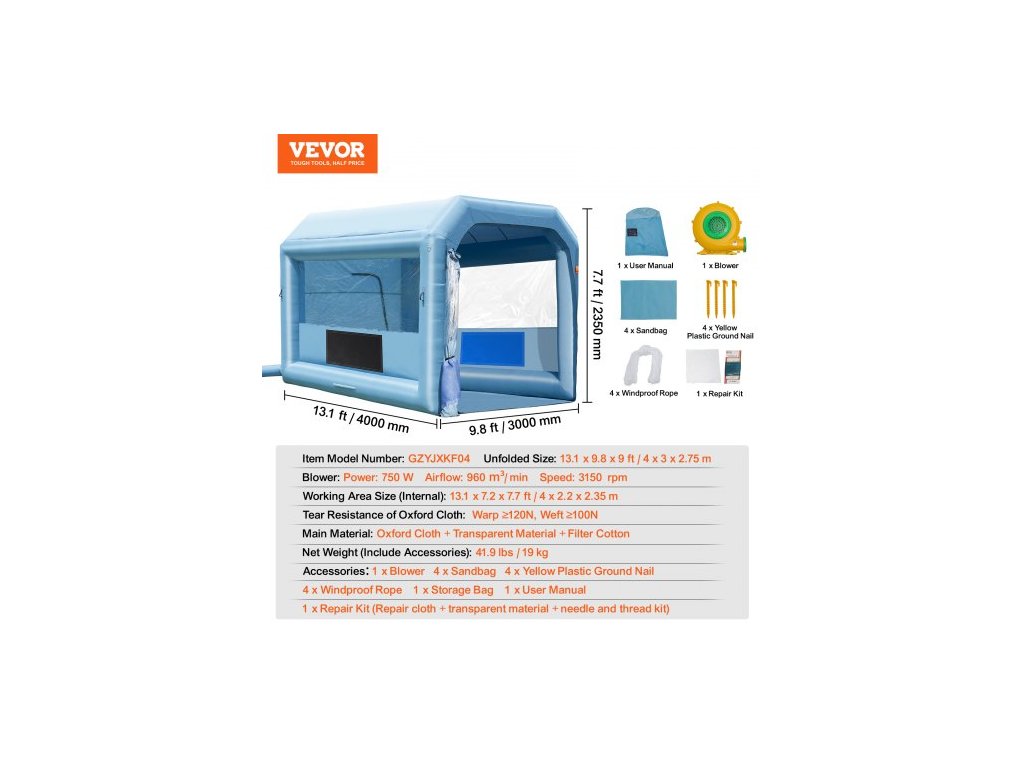 Průtok vzduchu: 960 m3/min, Rychlost: 3150 ot/min, Čistá hmotnost (včetně veškerého příslušenství): 41,9 lbs / 19 kg, Výkon ventilátoru: 750 W, Číslo modelu položky: GZYJXKF04, Velikost pracovní plochy (vnitřní): 13,1 x 7,2 x 7,7 stop / 4 x 2,2 x 2,35 m, Odolnost proti roztržení oxfordské látky: Osnova >=120N, Útek >=100N, Rozměry v rozloženém stavu: 13,1 x 9,8 x 9 stop / 4 x 3 x 2,75 m, Hlavní materiál: Oxfordská tkanina + Průhledný materiál + Filtrační bavlna