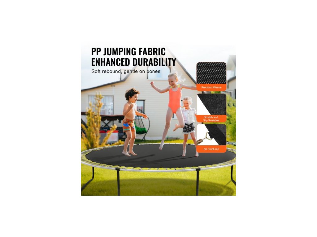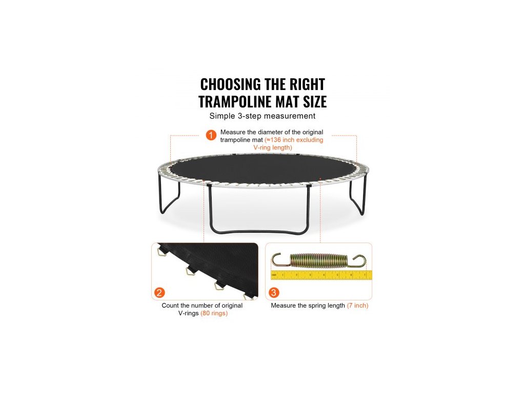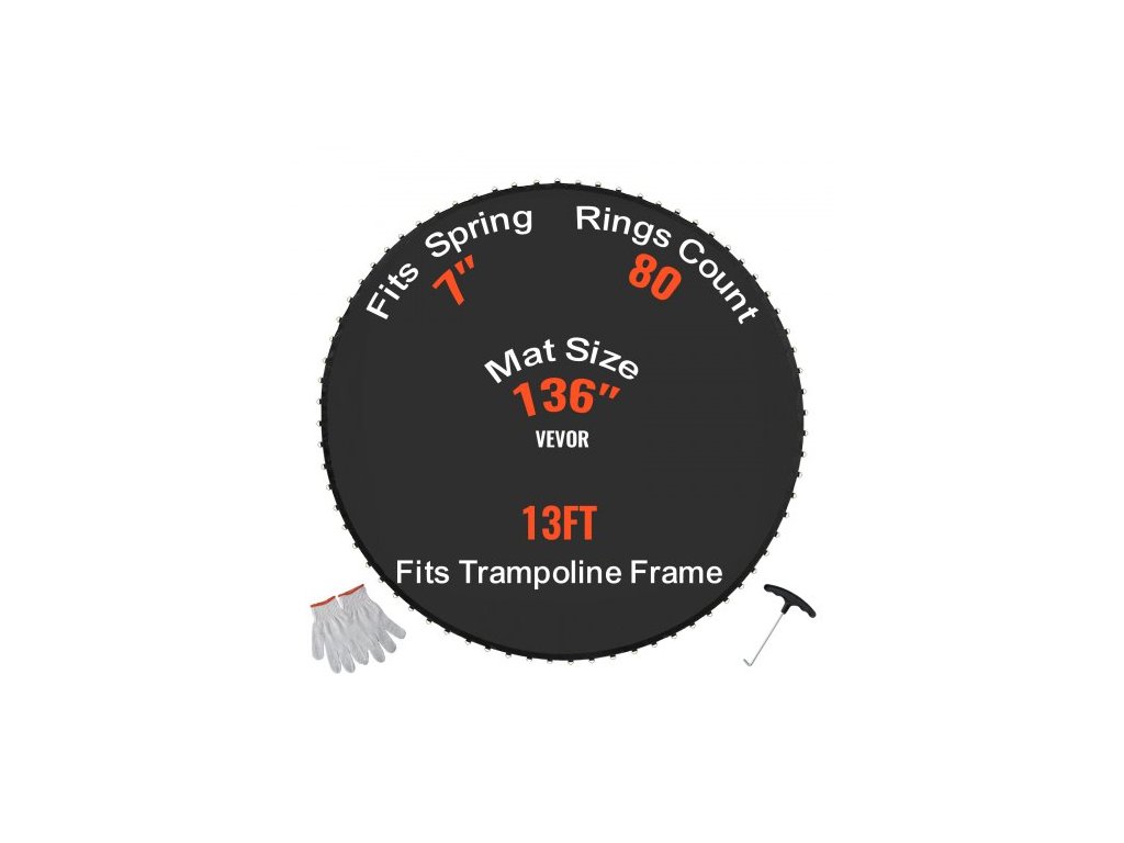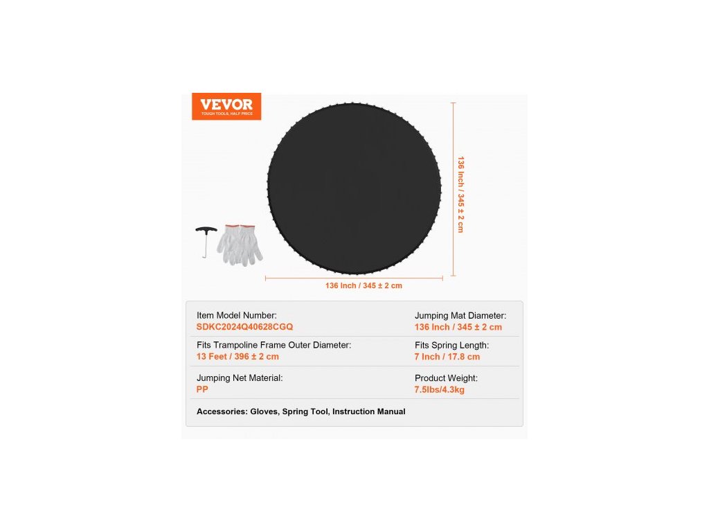 Pasuje na délku pružiny: 7 palců / 17,8 cm, průměr skákací podložky: 136 palců / 345 cm, číslo modelu položky: SDKC2024Q40628CGQ, hmotnost výrobku: 7,5 lbs / 4,3 kg, pasuje na rám trampolíny, vnější průměr: 13 stop / 396 cm, materiál skákací sítě: PP