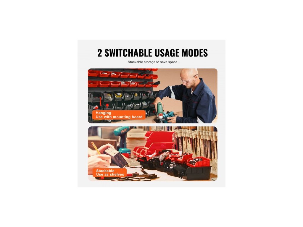 Nástěnné úložné boxy, 48-boxový organizér na díly do garáže, plastový dílenský organizér s nástěnnými panely, organizér na nářadí na matice, šrouby, vruty, hřebíky, korálky, knoflíky a další malé díly, černá a červená