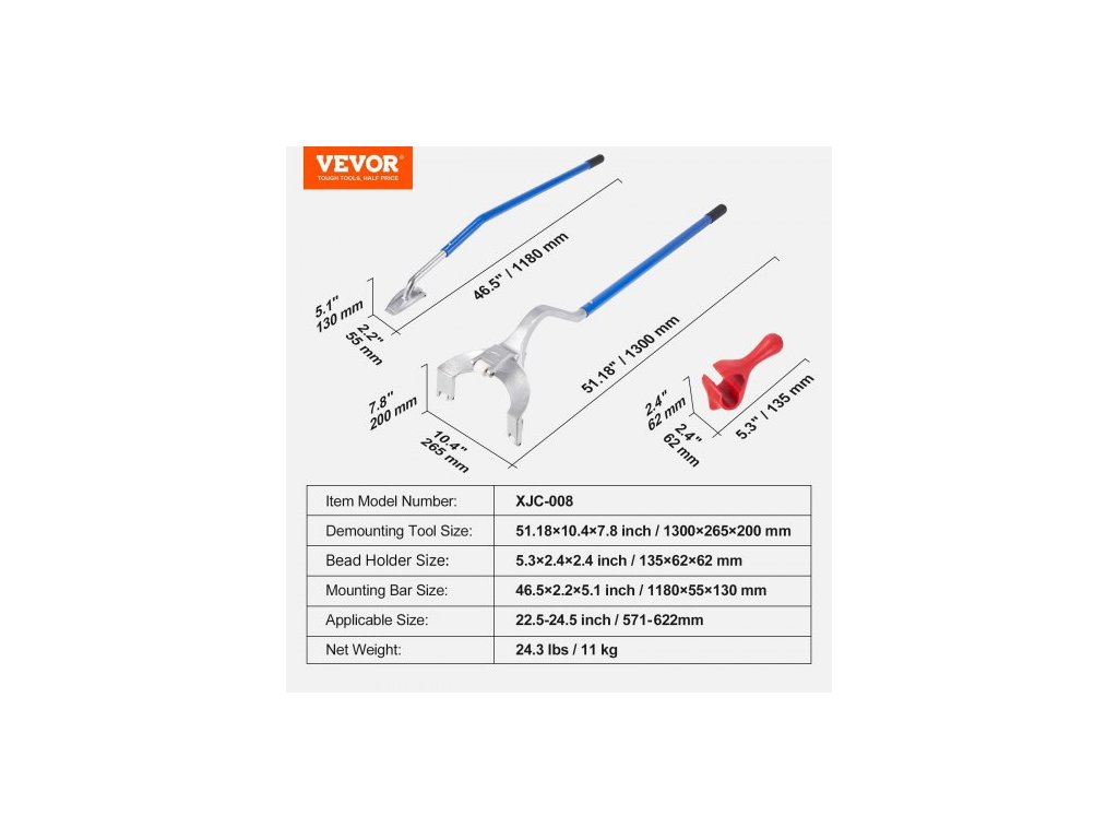 Rozměry demontážního nástroje: 51,18 × 10,4 × 7,8 palce/1300 × 265 × 200 mm,Rozměry montážní lišty: 46,5 × 2,2 × 5,1 palce/1180 × 55 × 130 mm,Číslo modelu položky: XJC-008,Rozměry držáku patky: 5,3 × 2,4 × 2,4 palce/135 × 62 × 62 mm,Čistá hmotnost: 24,3 lbs/11 kg,Použitelná velikost: 22,5–24,5 palce/571–622 mm
