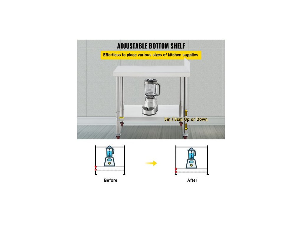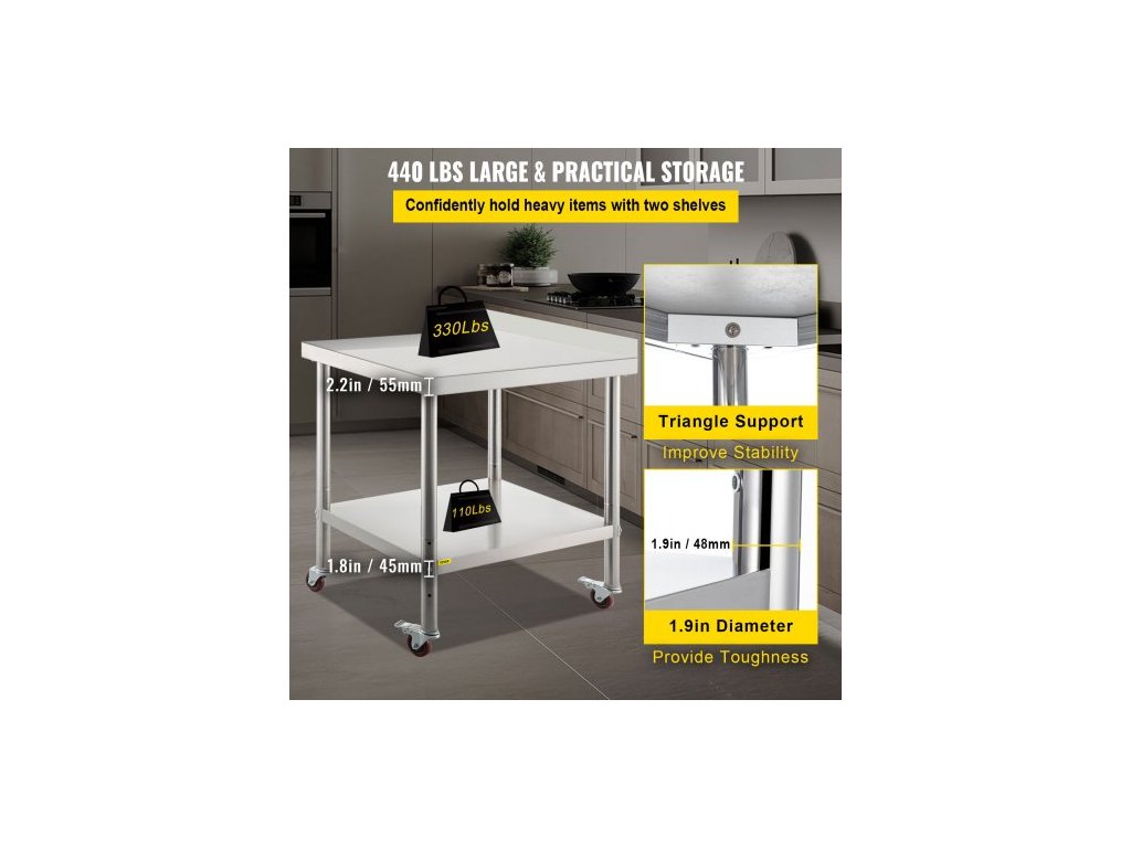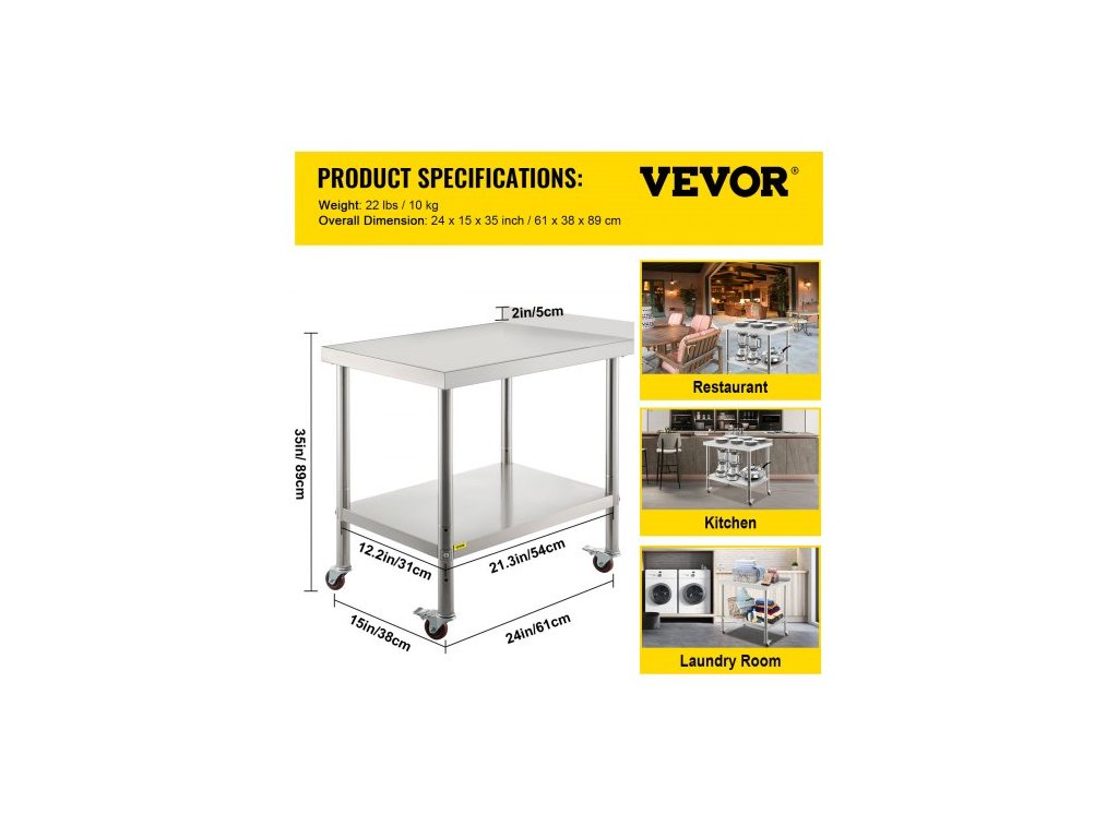 Nosnost spodní police: 110 liber / 50 kg,Rozměry spodní police: 21,3 x 12,2 palce / 54 x 31 cm,Rozměry položky: 24 x 15 x 35 palců / 61 x 38 x 89 cm,Výška obkladu: 2 palce / 5 cm,Model: VV-SSWT-BJL-1524,Materiál: Nerezová ocel,Nosnost horní police: 330 liber / 150 kg,Vzdálenost Mezi dvěma policemi: 16,9-20,1-23,2 palce / 43-51-59 cm, Hmotnost položky: 22 liber / 10 kg, Průměr nohou stolu: 1,9 palce / 48 mm