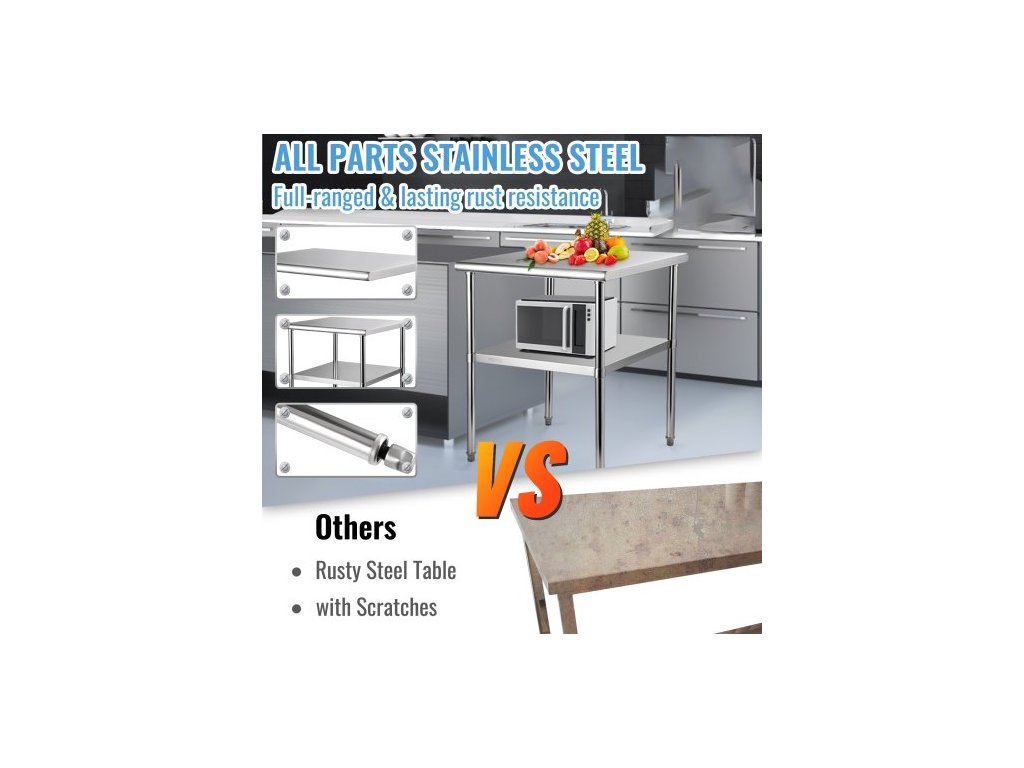 Rozměry spodní police: 26 x 26 x 1,6 palce (66 x 66 x 4 cm),Rozměry stolu: 30 x 30 x 36 palců (76,2 x 76,2 x 91,4 cm),Rozměry horní police: 30 x 30 x 1,6 palce (76,2 x 76,2 x 4 cm),Rozsah nastavitelných nohou: 0-0,8 palce (0-2 cm),Model: VV-SSWR-30*30,Nosnost spodní police Nosnost: 136 kg, hmotnost stolu: 21 kg, materiál: nerezová ocel 201, nosnost horní police: 226 kg, vzdálenost mezi dvěma policemi: 0–32,1 palce (0–81,5 cm)