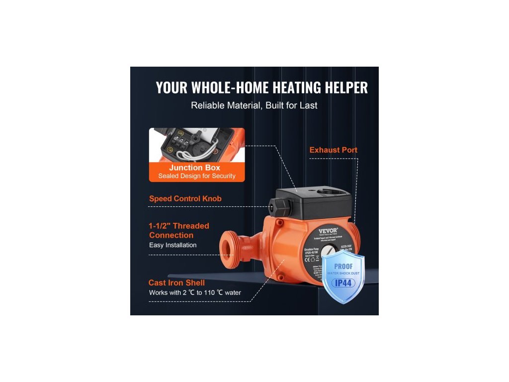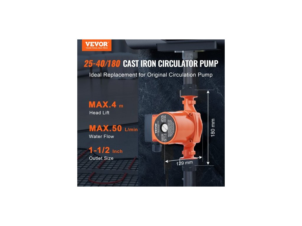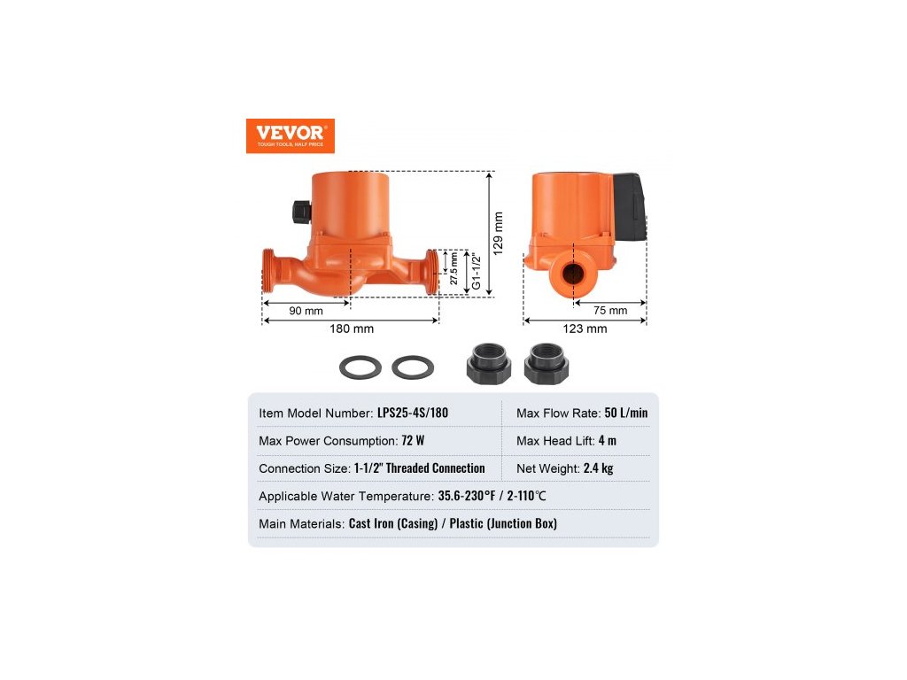 Hlavní materiály: Litina (pouzdro) / Plast (spojovací krabice), Maximální výtlak: 4 m, Typ připojení: Závitové připojení 1-1/2", Číslo modelu položky: LPS25-4S-180, Maximální průtok: 50 l/min, Použitelná teplota vody: 2 - 110 °C, Čistá hmotnost: 2,4 kg, maximální spotřeba energie: 72 W