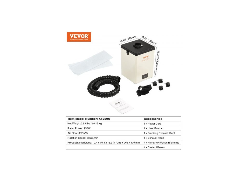 Průtok vzduchu: 332 m3/h,Číslo modelu: XF250,Vstupní napětí: AC220-240V 50Hz,Jmenovitý výkon: 150W,Nízká hladina hluku: <=70 dB,Rozměry výrobku: 10,4 x 10,4 x 16,9 palce / 265 x 265 x 430 mm,Čistá hmotnost: 22,3 lbs / 10,13 kg,Otáčky: 5800 ot./min