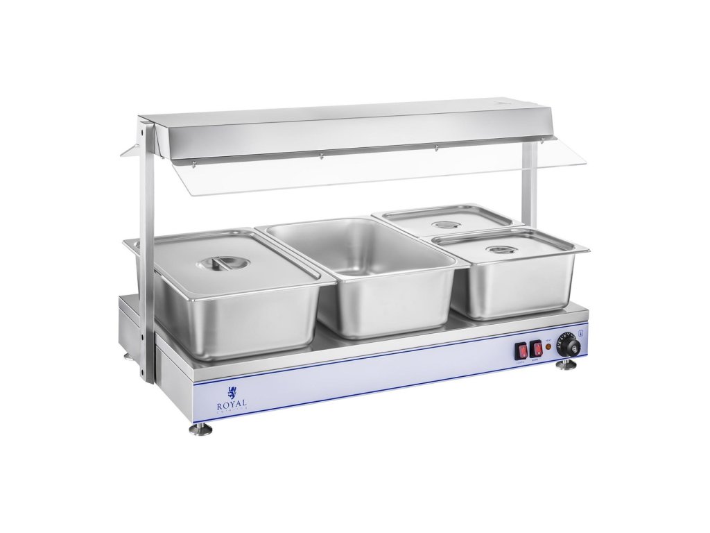 Ohřívací deska RCHP-100H od Royal Catering se hodí do bufetů, cateringu, nebo kantýn, aby šetrně po dlouhou dobu udržovala pokrmy na ideální teplotě. S tímto stolním zařízením mohou být veškeré pokrmy Vašim hostům nabízeny perfektně temperované. Přitom může být plotna použitá nejen na udržení teploty s nádobami, nebo miskami, ale také na uchovávání pokrmů přímo na desce. Již při na první pohled přesvědčí ohřívací deska RCHP-100H svým vysoce kvalitním zpracováním z ušlechtilé oceli. Na delší udržování teploty pokrmů je Vám k dispozici celková varná plocha 100 x 50 cm. Současně se vyznačuje svou kompaktností a hodí se bez problémů na pracovní plochy, na kterých je málo místa. Potraviny jsou chráněné dvěma plexiskly na nástavbách na obou stranách. Ohřevná plocha, která je taktéž vyrobena z ušlechtilé oceli, Vám umožňuje pokrmy ohřívat přímo na svém povrchu. Tím není nutné používat nádoby a při čištění si tak ušetříte drahocenný čas. Čas ušetříte i díky ploše, která se lehce čistí a udržuje. Vestavěný topný element poskytuje výkon 650 W, čímž se spotřebovává spodní teplo, aby ohřívalo malé a velké množství potravin. Aby bylo garantováno rovnoměrné a efektivní teplo, udržuje deska potraviny se třema vestavěnými halogenovými lampami teplé i seshora. Každá z lamp přináší vedle osvětlení pro hosty také výkon navíc o hodně 300 W, což přináší celkový výkon 1550 W. Konstantní teplota je obzvláště důležitá při dlouhodobém udržování teploty. Ohřívač na potraviny nabízí díky regulátoru teploty s ukazatelem stupňů nastavení teploty dle přání mezi 0 a 110 °C, které garantuje i po mnoha hodinách teplé a lahodné pokrmy. Vedle oddělených spínačů na topný povrch a lampy signalizuje kontrolka připravenosti dosažení teploty. Aby byla ohřívací deska mobilnější, může se ohřevný element libovolně odšroubovat. V této formě ohřívá zařízení s nastavitelnou teplotou ze spodu. O stabilitu na všech podložích se starají 4 nastavitelné nožičky. Ty jsou vybaveny protiskluzovou gumou, díky čemuž deska zůstane tam, kde má.