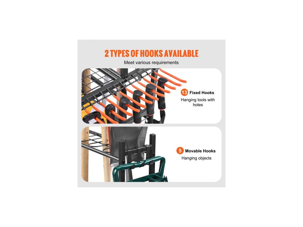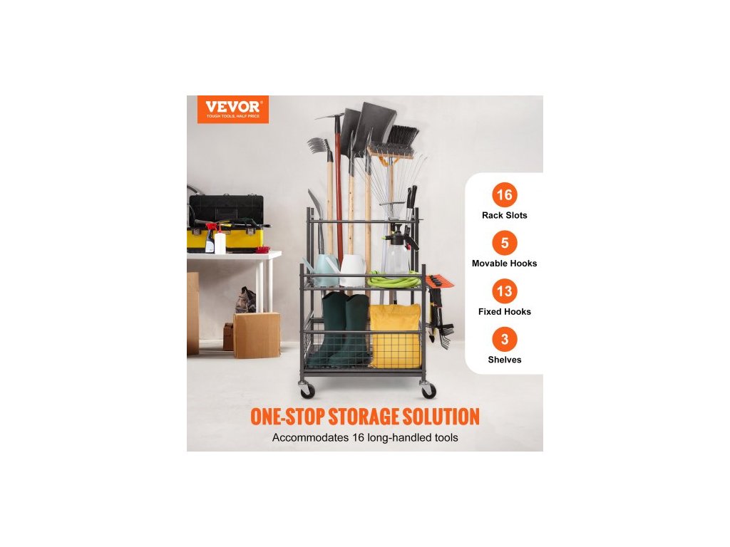 Organizér na zahradní nářadí , 16 přihrádek s háčky, věžový stojan na nářadí s kolečky pro organizaci a skladování v garáži, pro uložení nářadí s dlouhou rukojetí/hrábě/koštěte, kovový stojan na nářadí do kůlny, venkovní