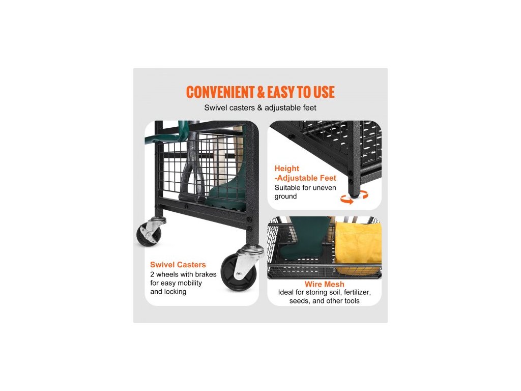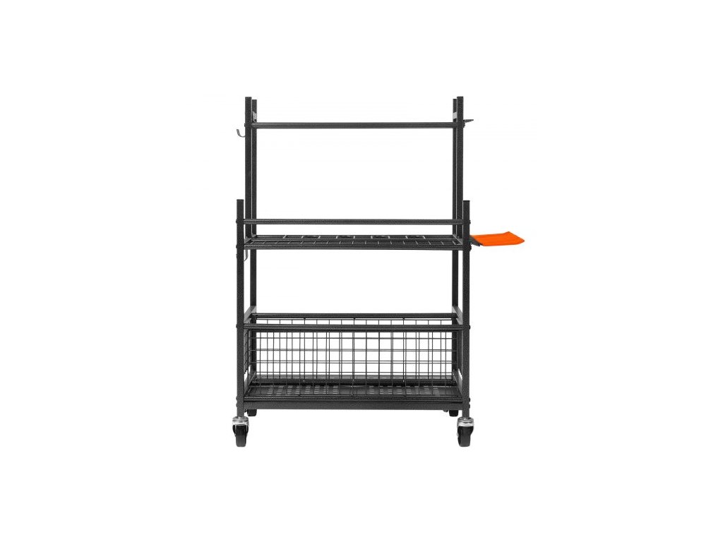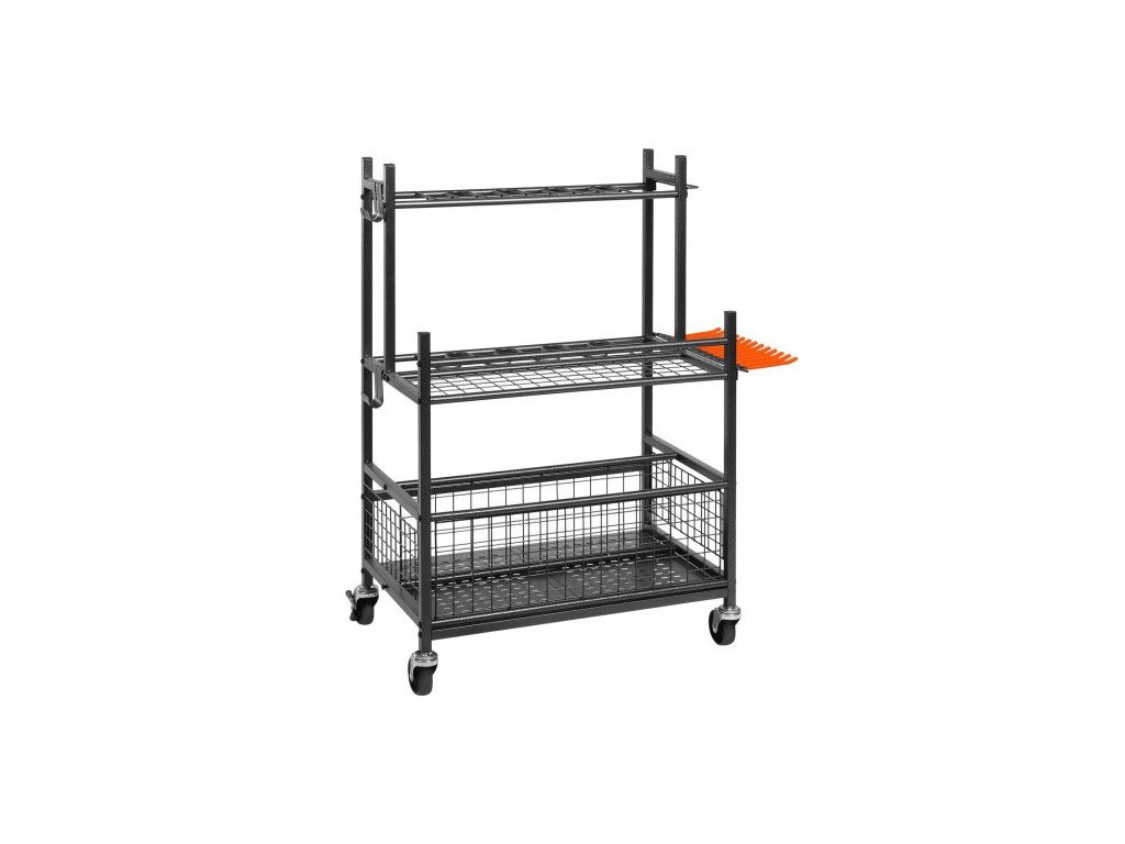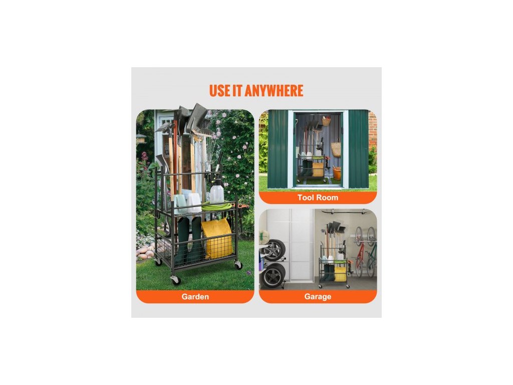 Organizér na zahradní nářadí , 16 přihrádek s háčky, věžový stojan na nářadí s kolečky pro organizaci a skladování v garáži, držák na nářadí s dlouhou rukojetí/hrábě/koště, kovový stojan na nářadí do kůlny, venkovní