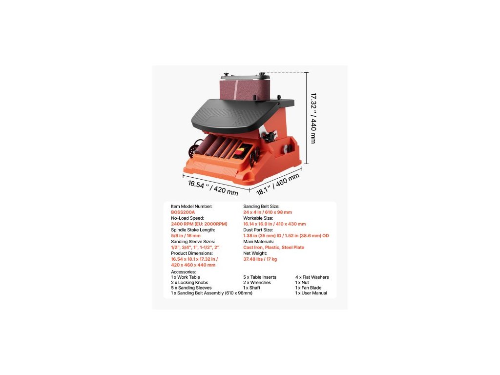 Délka zdvihu vřetena: 5/8 palce / 16 mm,Hlavní materiály: Litina, plast, ocelový plech,Číslo modelu položky: BOSS200A,Velikosti brusných objímek: 1/2", 3/4", 1", 1-1/2", 2",Otáčky bez zatížení: 2000 ot./min.,Velikost brusného pásu: 24 x 4 palce / 610 x 98 mm,Zpracovatelná velikost: 16,14 x 16,9 palce / 410 x 430 mm,Rozměry výrobku: 16,54 x 18,1 x 17,32 palce / 420 x 460 x 440 mm,Velikost otvoru pro odsávání prachu: vnitřní průměr 1,38 palce (35 mm) / vnější průměr 1,52 palce (38,6 mm),Čistá hmotnost: 37,48 liber / 17 kg