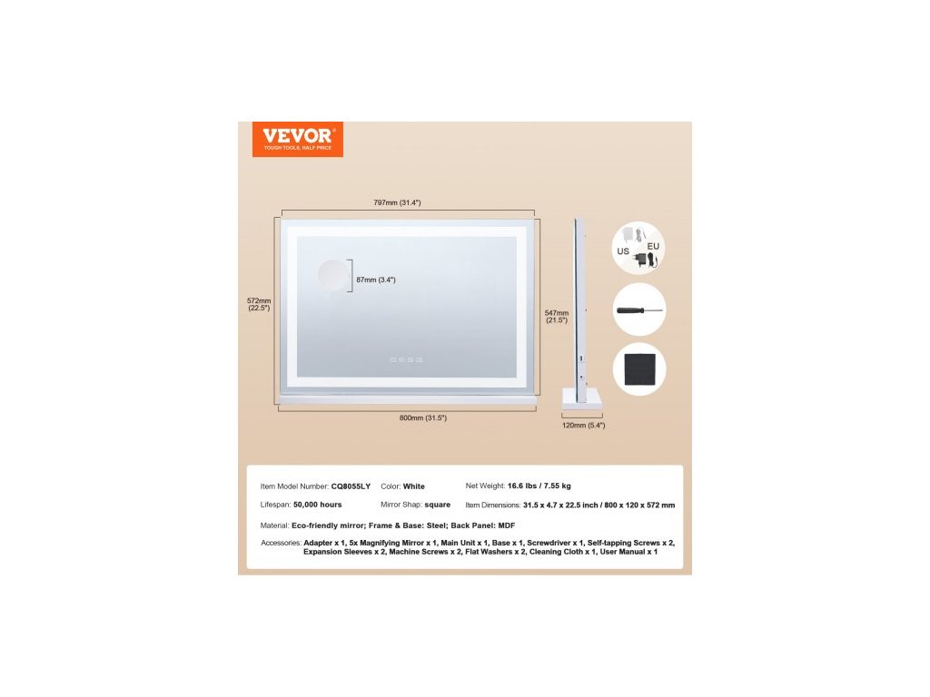 Tvar zrcadla: Čtvercový,Barva: Bílá,Číslo modelu položky: CQ8055LY,Rozměry položky: 31,5 x 4,7 x 22,5 palce / 800 x 120 x 572 mm,Materiál: Ekologické zrcadlo; Rám a podstavec: Ocel; Zadní panel: MDF,Čistá hmotnost: 16,6 lbs / 7,55 kg,Životnost: 50 000 hodin