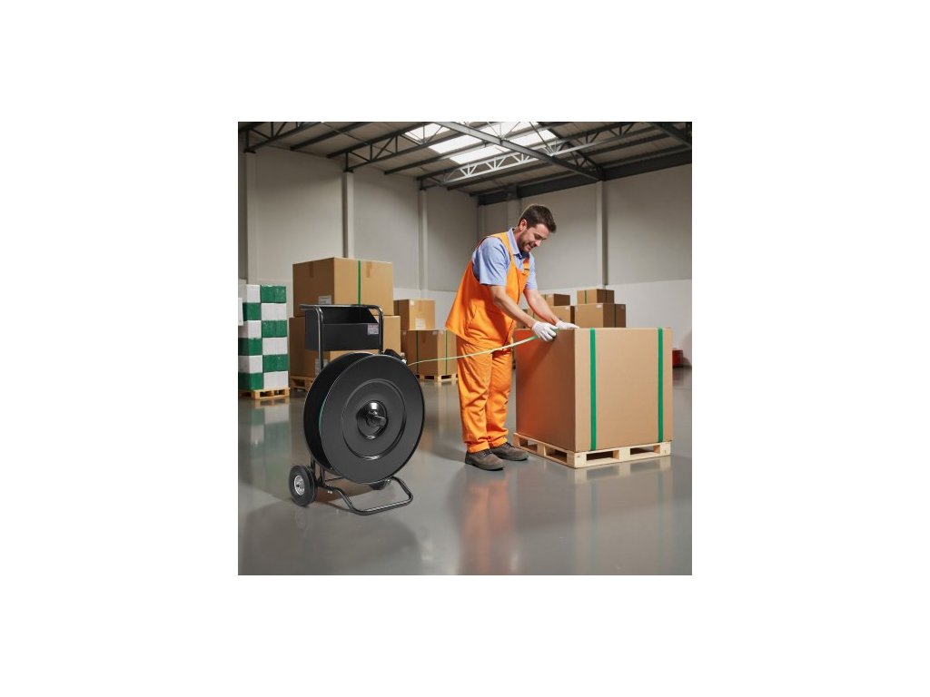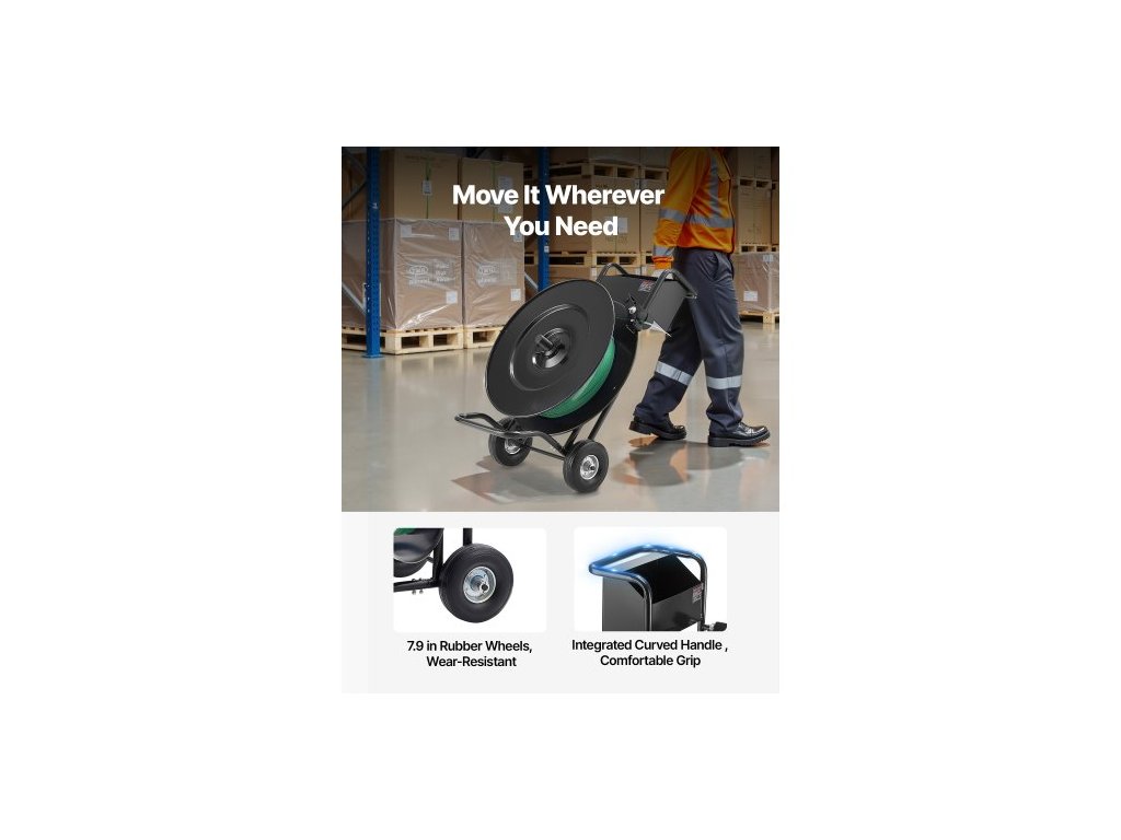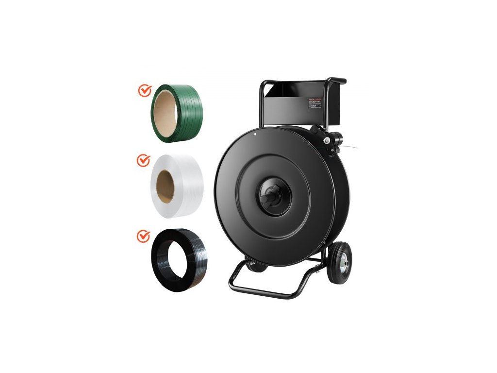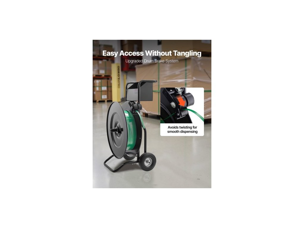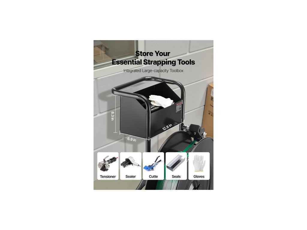 Páskovací vozík , vhodný pro PET / PP / ocelové pásky s průměrem jádra 20,3/40,6 cm, odolný páskovací dávkovač vybavený upgradovanou bubnovou brzdou, vestavěný prostorný zásobník na nářadí
