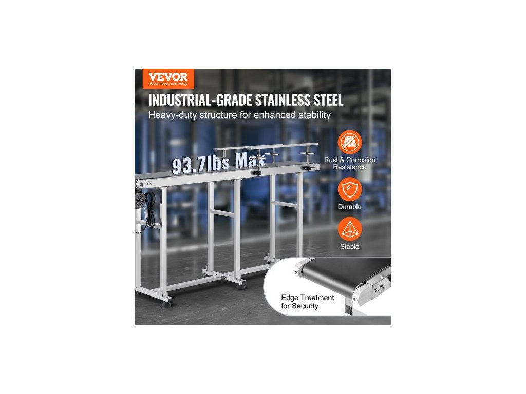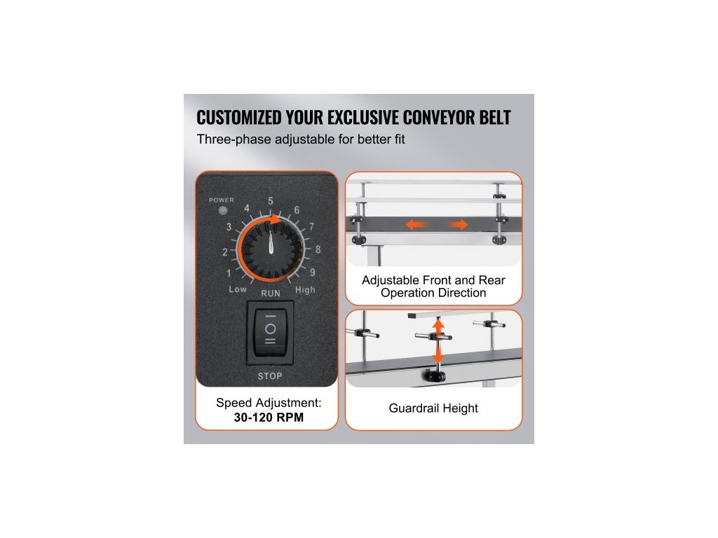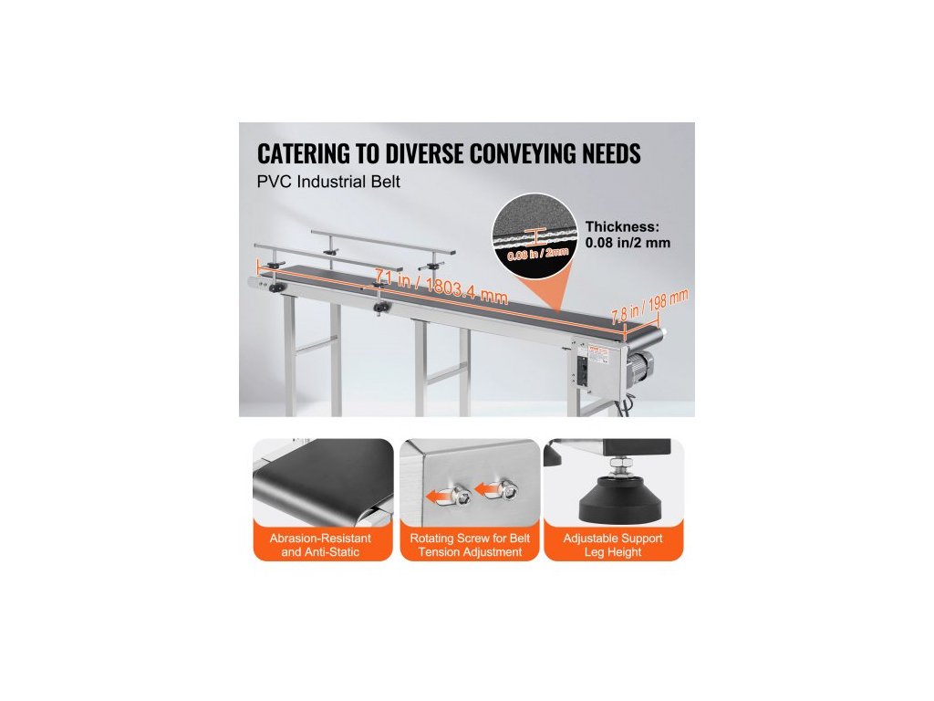 Nosnost: 93,70 lbs/42,5 kg,Číslo modelu položky: MS18020,Hmotnost výrobku: 47,40 lbs/21,5 kg,Materiál: Nerezová ocel 201,Rychlost dopravního pásu: Obousměrná proměnná rychlost, 31,5 m/min,Rozměry pásu: 71 x 7,8 palce/1803,4 x 198,1 mm,Šířka stolu: 9,9 palce/252 mm,Rozměry výrobku: 70,67 × 14,25 × 35,83 palce / 1795 × 362 × 910 mm
