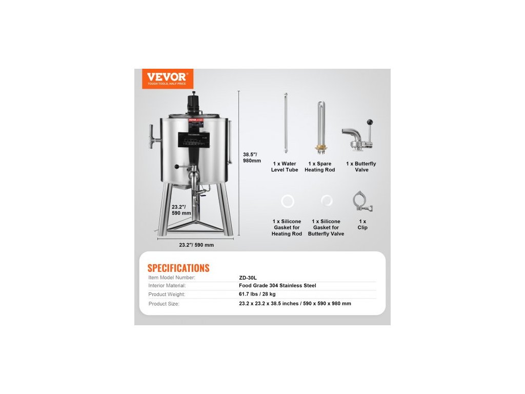 Číslo modelu: ZD-30L, Hmotnost výrobku: 61,7 lbs / 28 kg, Vnitřní materiál: Potravinářská nerezová ocel 304, Rozměry výrobku: 23,2 x 23,2 x 38,5 palce / 590 x 590 x 980 mm