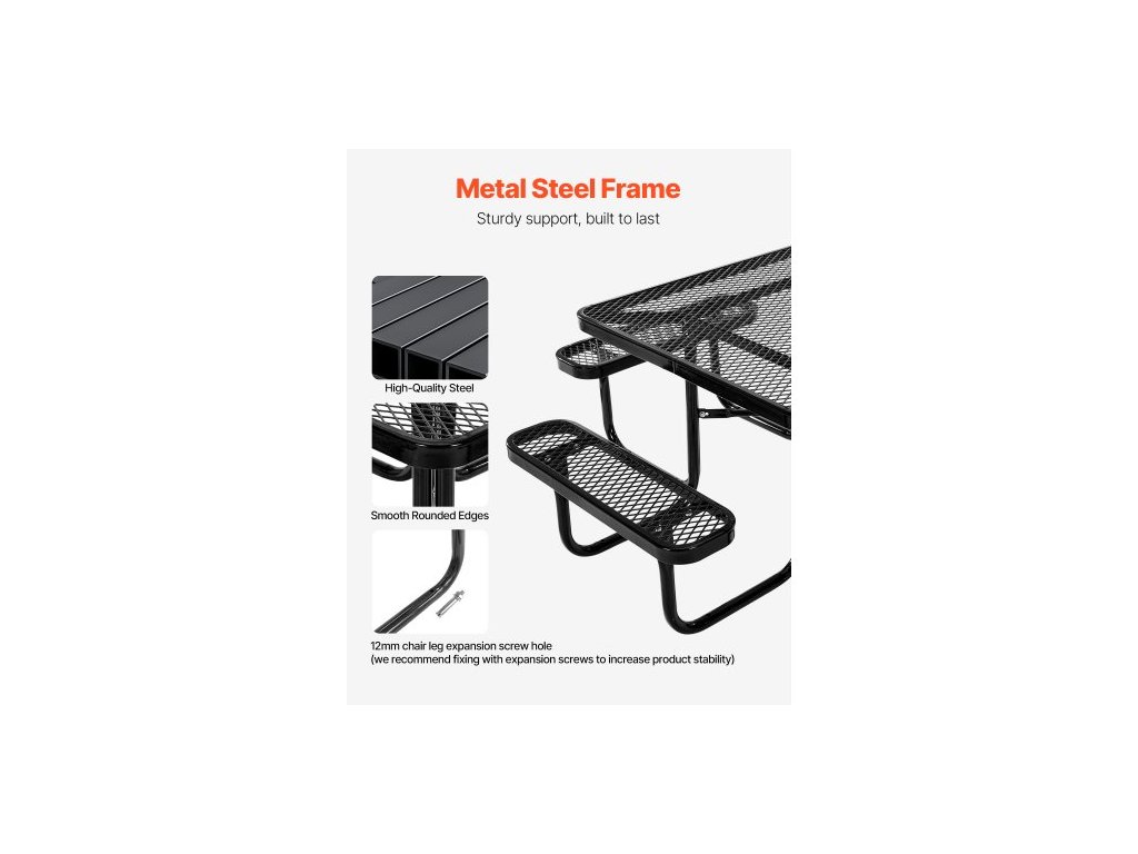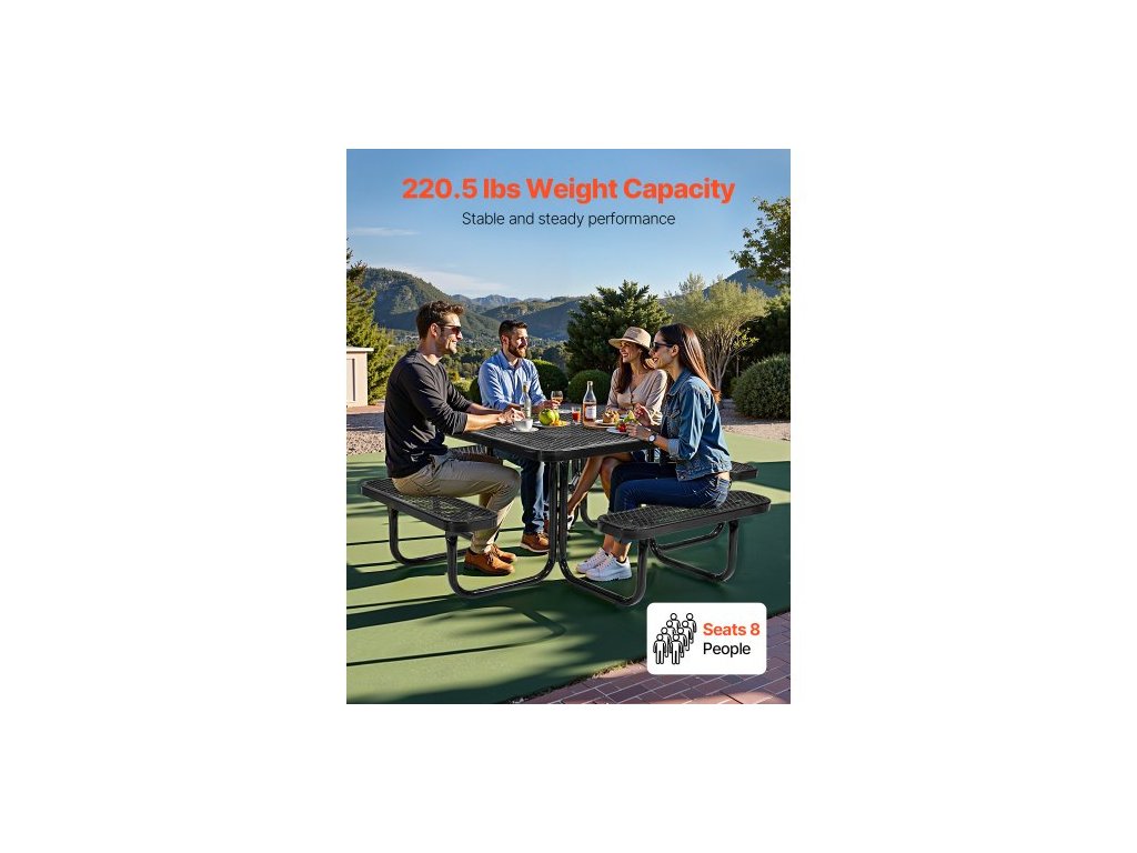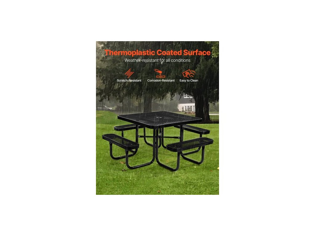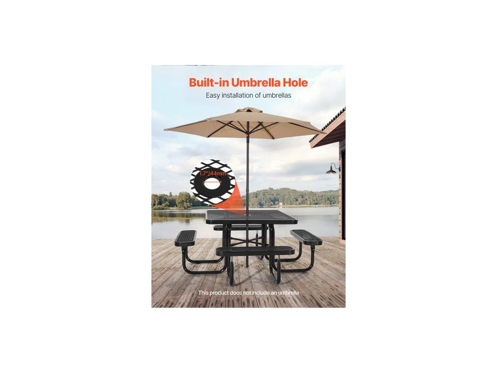 Piknikový stůl , venkovní jídelní sada odolná vůči povětrnostním vlivům, vysoce odolné ocelové stoly s povlakem a otvorem pro slunečník, čtvercový stůl a lavice o rozměrech 45,7 palce, pro zahradu, dvorek, verandu, černá