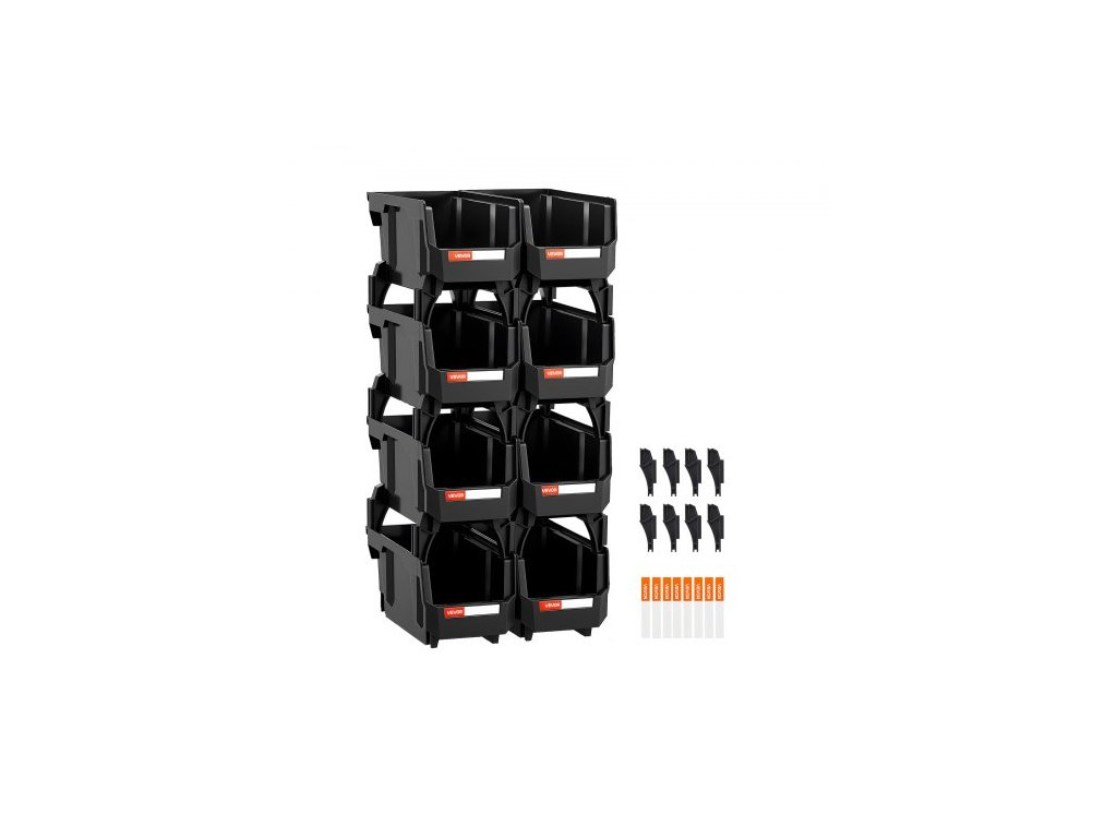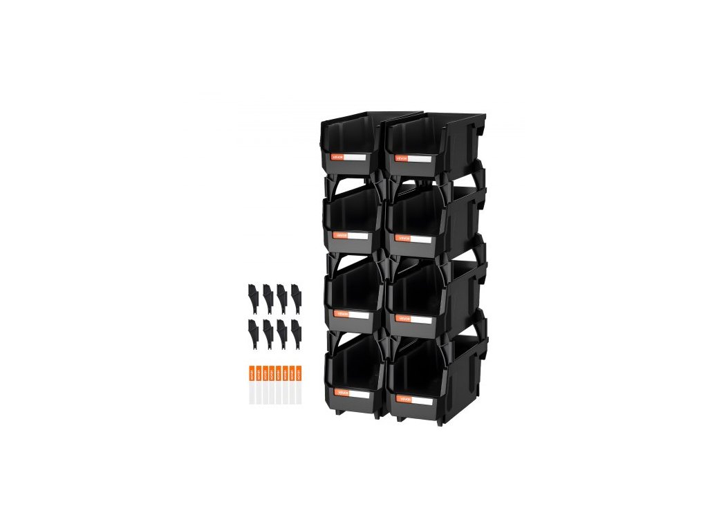 Plastové stohovatelné úložné boxy, 27,6 x 14 x 13 cm (balení po 8 kusech), plastové nádoby na organizaci a úložné boxy do skříně, garáže, na drobné díly, kancelářské potřeby a další příslušenství, černé