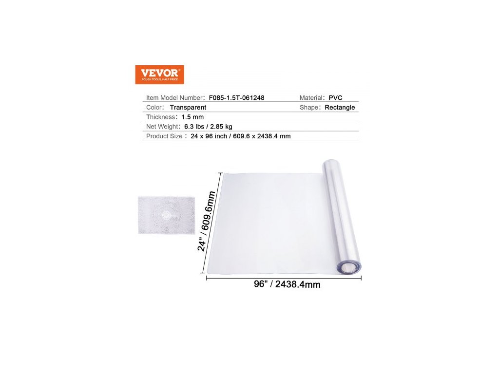 Tloušťka: 1,5 mm,Tvar: Obdélník,Rozměr chrániče stolu: 24x96 palců / 609,6x2438,4 mm,Barva: Průhledná,Číslo modelu položky: F085-1.5T-061248,Materiál: PVC,Čistá hmotnost: 6,3 lbs / 2,85 kg
