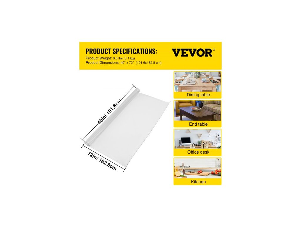 Tloušťka: 1,5 mm,Tvar: Obdélník,Rozměry ubrusu: 11,8 x 18,1 palce / 30 x 46 cm,Rozměry výrobku: 40 x 72 palce / 101,6 x 182,8 cm,Maximální teplota: 80 °C/ 176 °F,Barva: Průhledná,Model: SL15-FT100183,Hmotnost výrobku: 6,8 lbs / 3,1 kg,Materiál: PVC