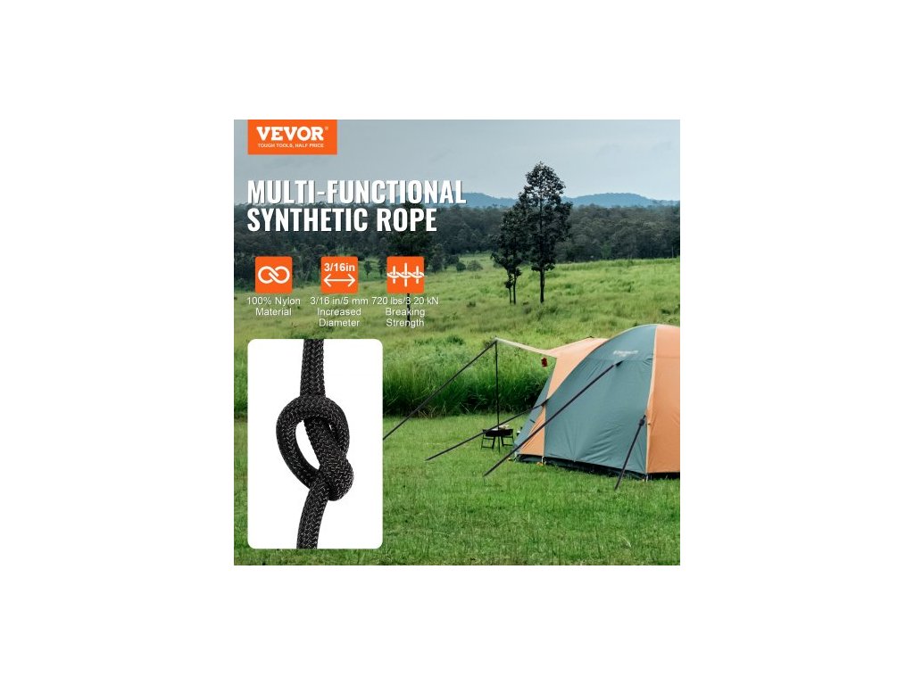 Pletené nylonové lano , 3/16 palce x 250 stop, 32 pramenů, pevnost v tahu 720 liber, venkovní lezecké lano, arboristické lano pro lezení po stromech, lano pro skalní turistiku, kempování, houpačku, slaňování, záchranu, černé
