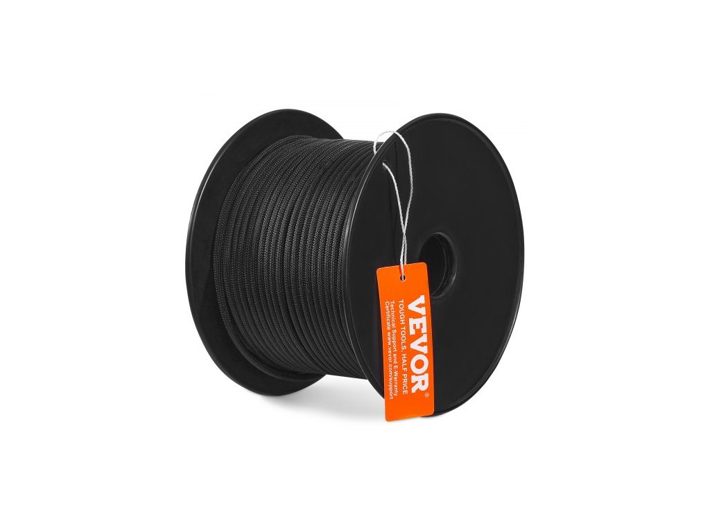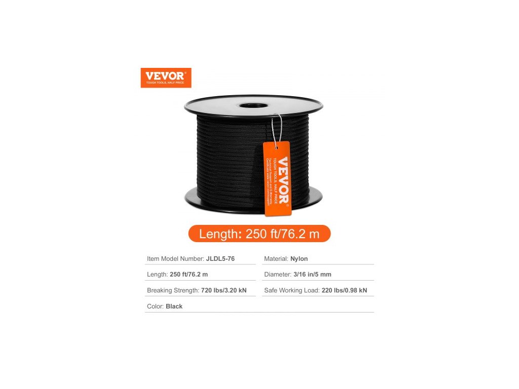 Délka: 250 stop/76,2 m, pevnost v tahu: 720 liber/3,20 kN,Barva: Černá,Číslo modelu položky: JLDL5-76,Bezpečné pracovní zatížení: 220 liber/0,98 kN,Materiál: Nylon,Průměr: 3/16 palce/5 mm