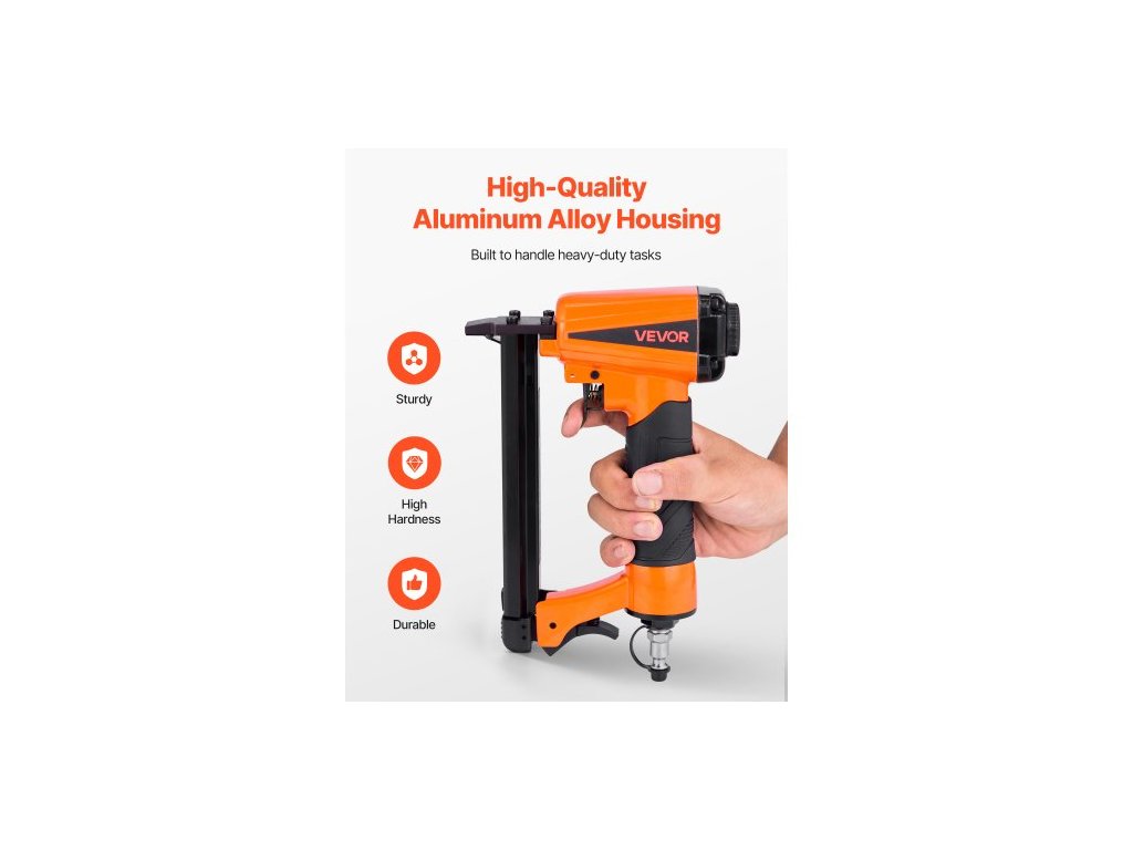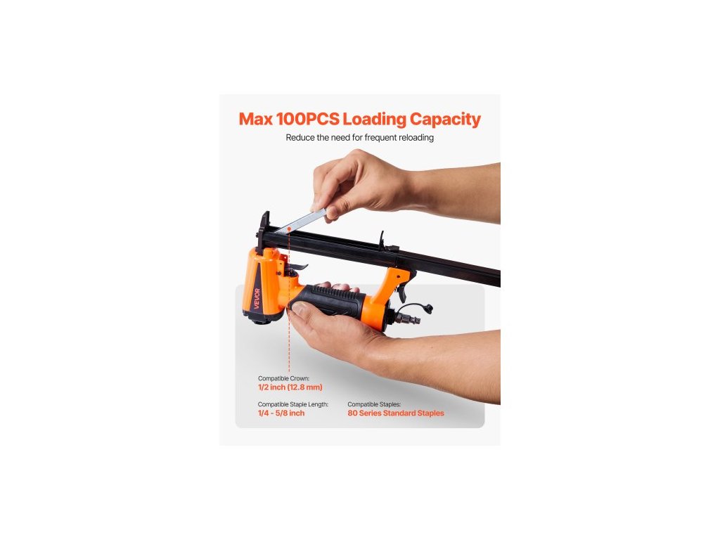 Provozní tlak: 70–110 PSI,Typ sešívačky: 21-Gauge,Kompatibilní délka sponek: 1/4–5/8 palce,Kapacita zásobníku: Max. 100 ks,Číslo modelu položky: V8016,Šířka kompatibilní korunky: 1/2 palce,Velikost vstupu vzduchu: 1/4" NPT,Kompatibilní sponky: Standardní sponky řady 80,Rozměry produktu: 9,45 x 1,89 x 6,50 palce / 240 x 48 x 165 mm, Čistá hmotnost: 2,2 lb / 1 kg, Hlavní materiál: Hliníková slitina