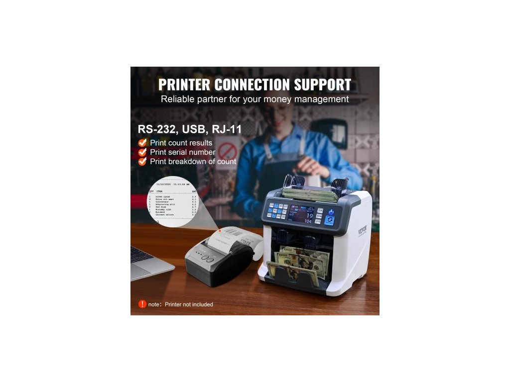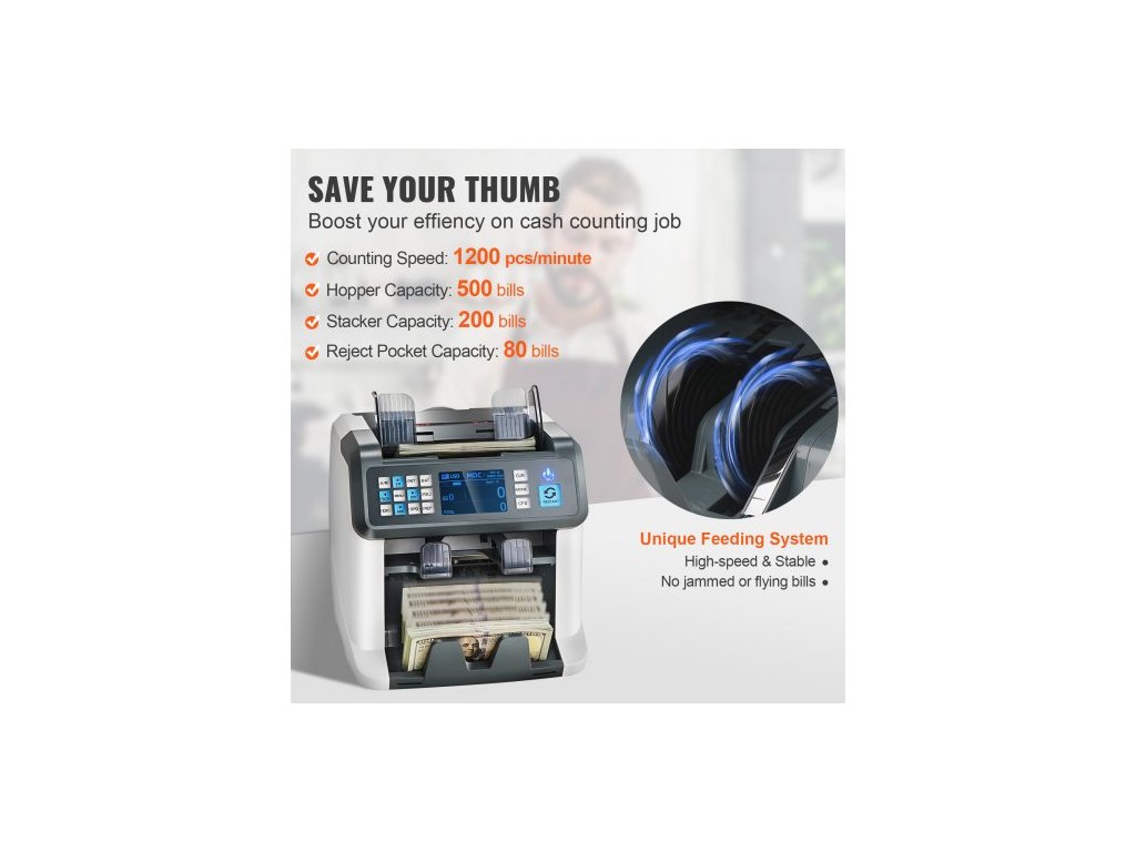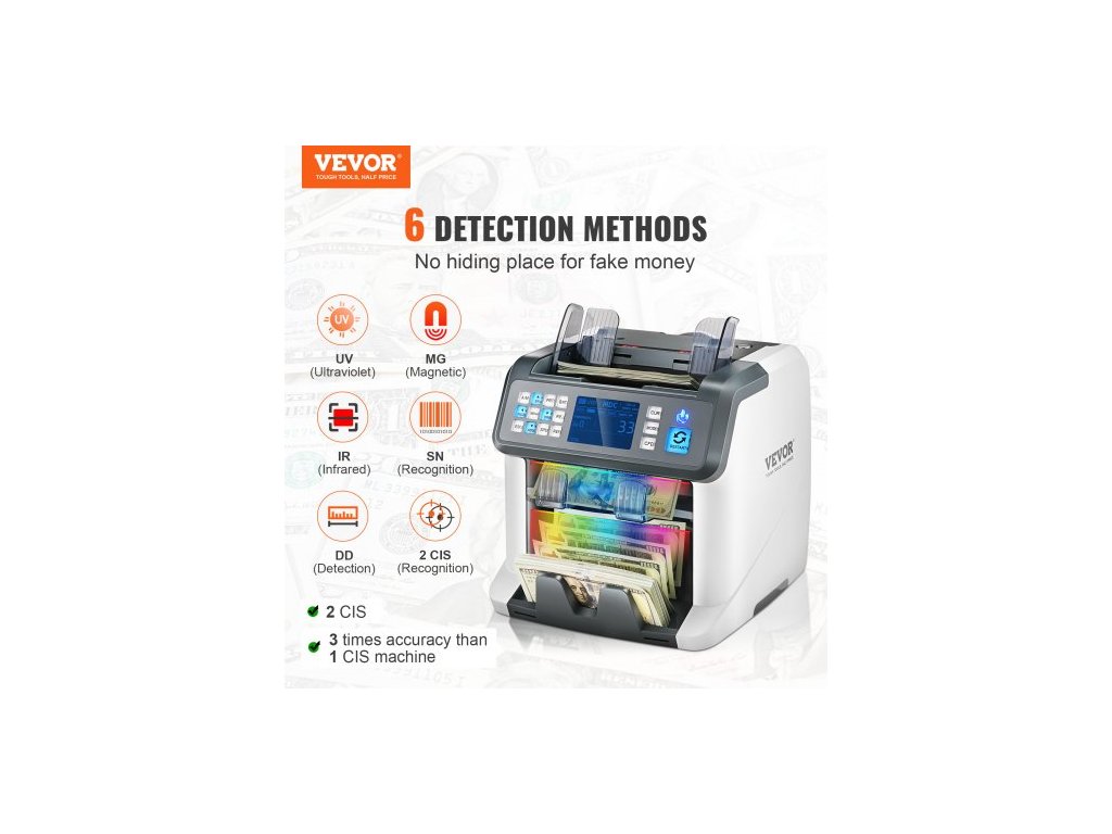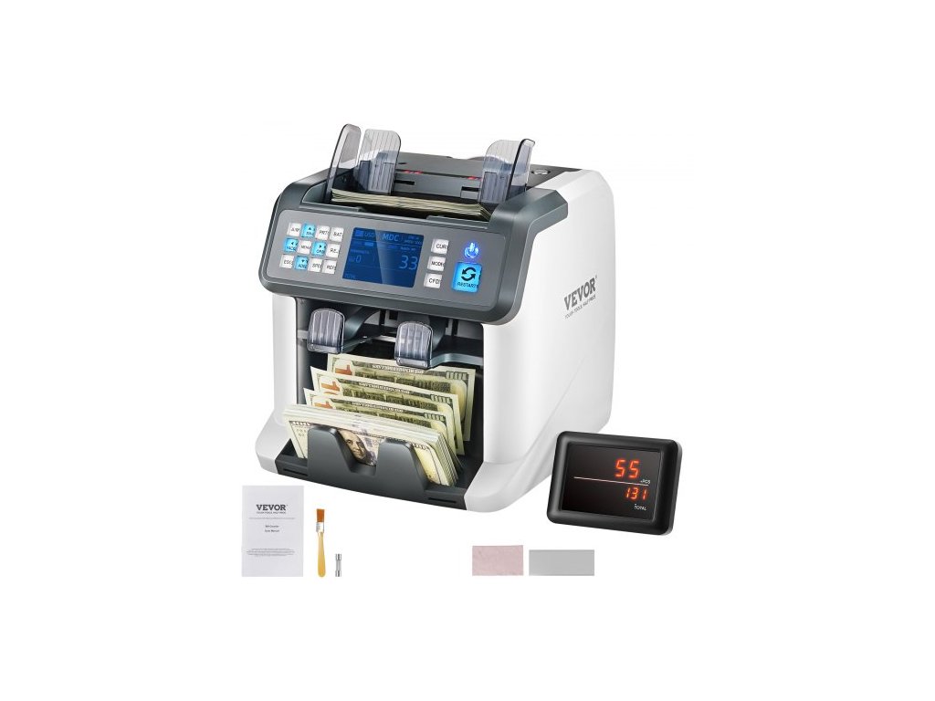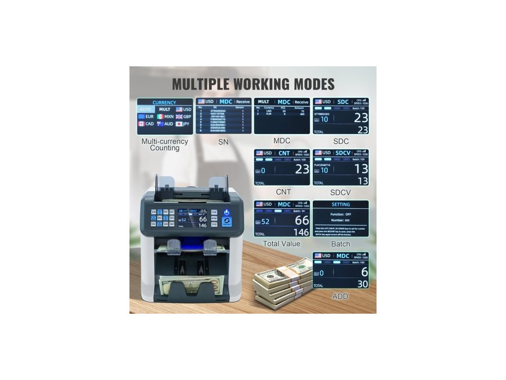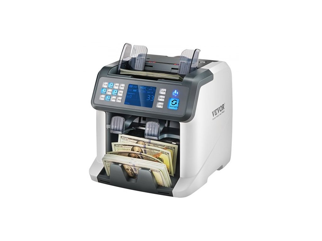 Počítačka bankovek , počítačka bankovek se smíšenou nominální hodnotou, detekce padělků 2CIS, SN, UV, IR, MG, DD, více měn, počítání a třídění hotovosti, tiskárna