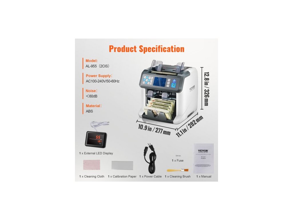 Systém podávání: Válečkový třecí systém, Konektor: RS-232, USB, RJ-11, Hlučnost: <60 dB, Rozměry: 282 × 277 × 326 mm, Materiál: ABS, Hmotnost: 9,25 kg, Napájení: AC100-240V/50-60Hz, Tloušťka počítatelných bankovek: 0,075-0,15 mm, Kapacita násypky: 500 bankovek, Zobrazení dávky: 3 číslice, Rychlost počítání: 800, 1000 ks/min (režim MDC SDC a CNT); 800, 1000, 1200 ks/min (pouze režim CTN), Zobrazení počítání: 4 číslice, Velikost počítatelných bankovek: 50x110-90x190 mm, Míra falešné detekce: 0,20 %, Číslo modelu položky: AL-955, Kapacita stohovače: 200 bankovek