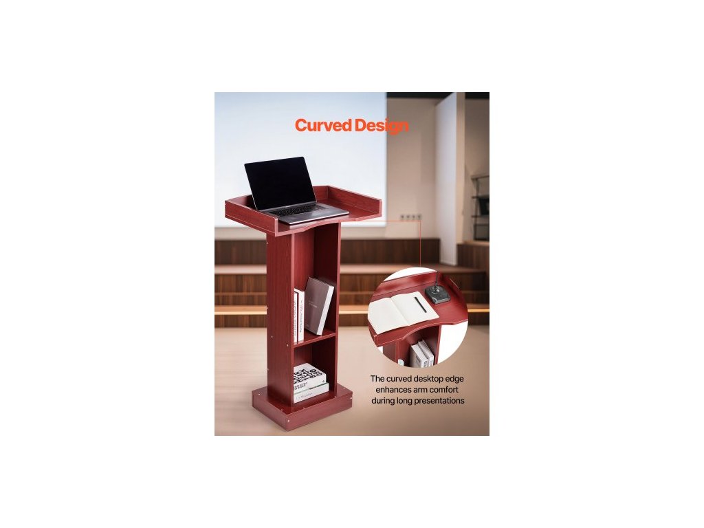 Pódiový stojan , dřevěný pultík 1040 mm, stůl na notebook se širokou čtecí plochou a odkládací policí, zarážka okrajů, elegantní design, možnost postavení na podlahu, pro učebny, konference, kostely a prezentace