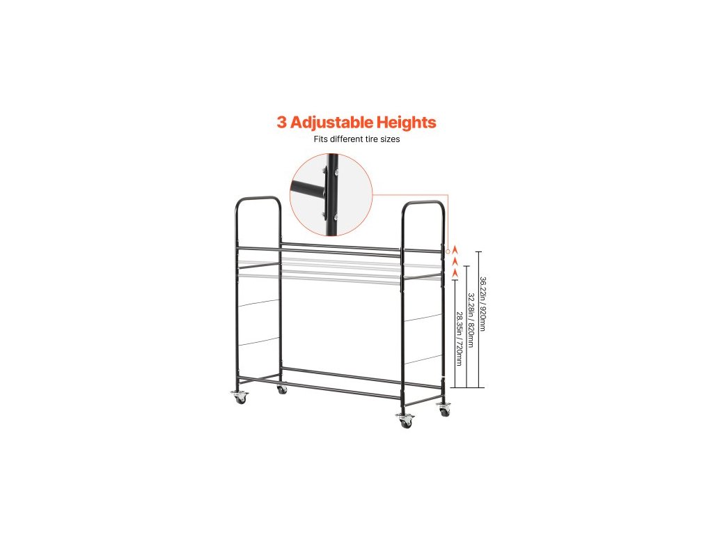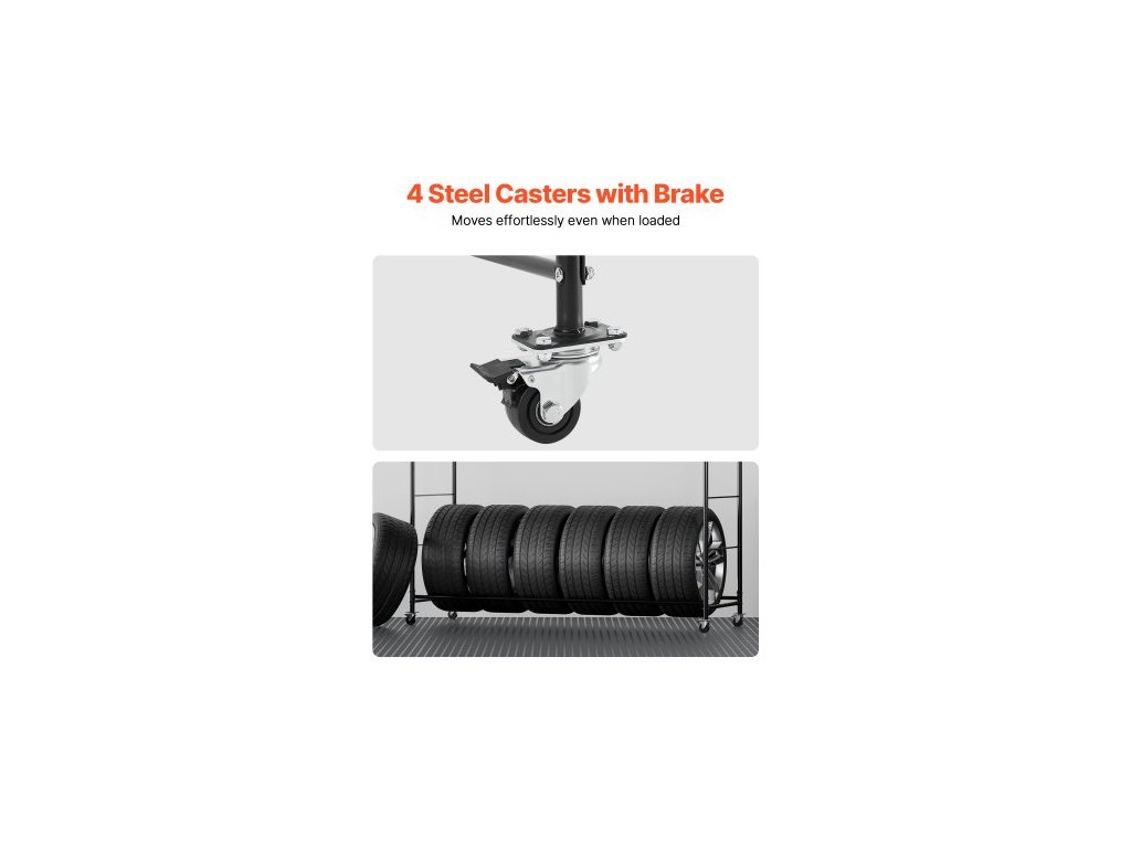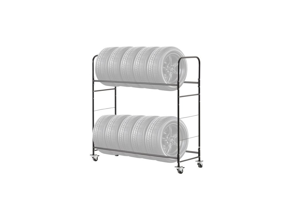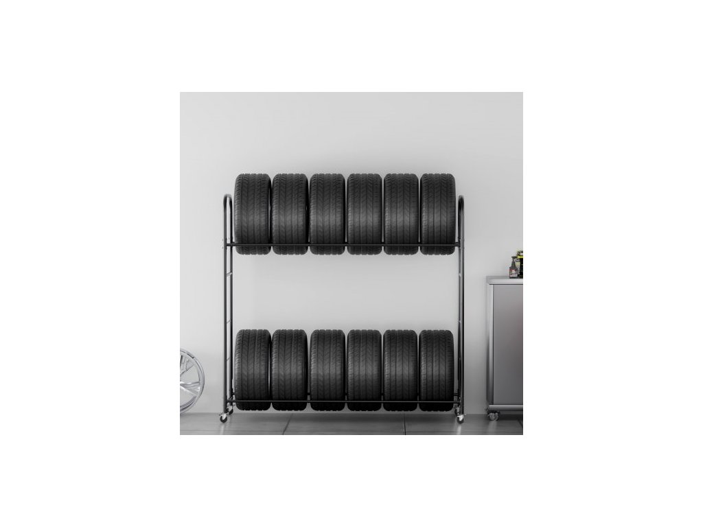 Pojízdný regál na pneumatiky, držák pneumatik se 2 policemi a přepravní přívěs do garáže, odolný ocelový vozík na pneumatiky s koly, nastavitelná výška a ochranný kryt, pojme až 12 standardních pneumatik