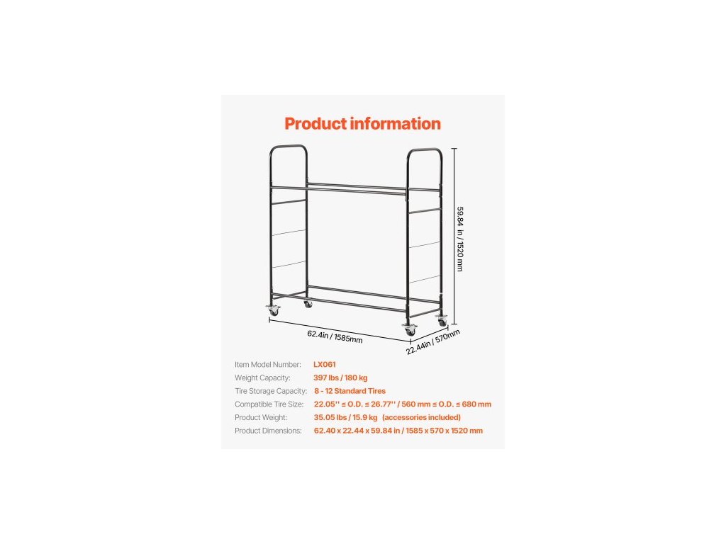 Rozměr pneumatiky: 22,05'' <= vnější průměr <= 26,77'' / 560 mm <= vnější průměr <= 680 mm (v závislosti na velikosti krytu proti prachu), Nosnost: 180 kg, Číslo modelu položky: LX061, Kapacita pro pneumatiky: 8–12 standardních pneumatik, Hmotnost výrobku: 15,9 kg (včetně příslušenství), Rozměry výrobku: 1585 x 570 x 1520 mm