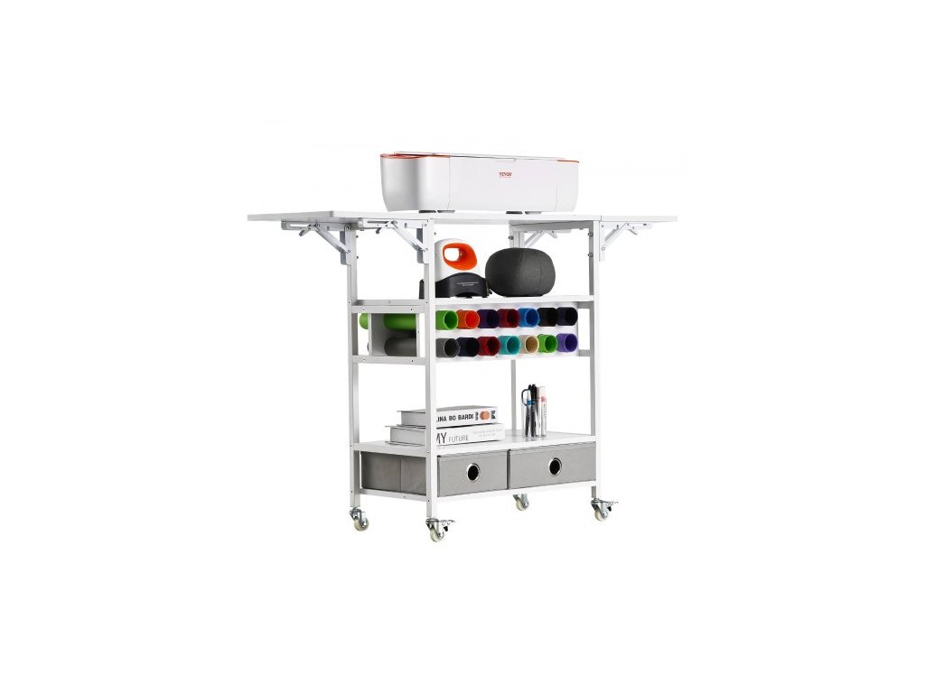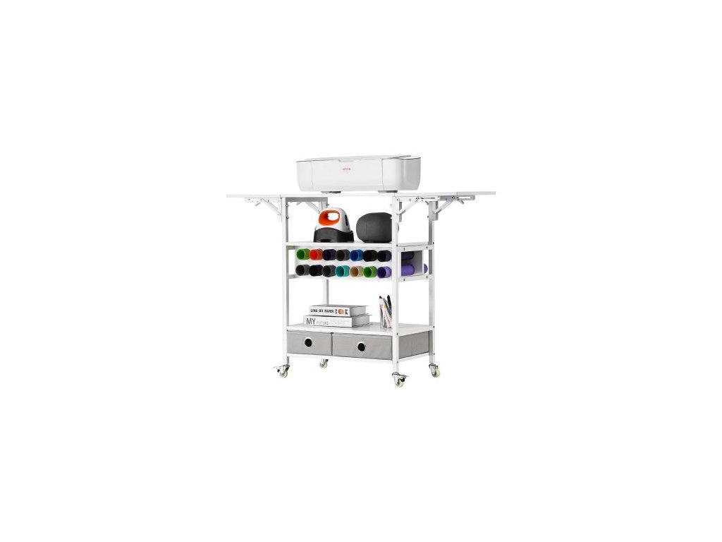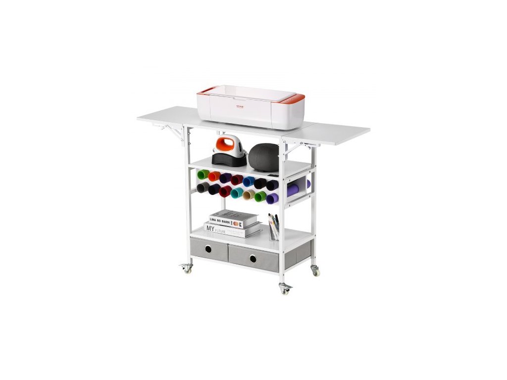 Pojízdný řemeslný vozík a úložný stůl, kompatibilní se stroji Cricut, skládací stůl Cricut se skládacími bočnicemi, pojízdný úložný organizér na řemeslné potřeby se 14 držáky na vinylové role a 2 zásuvkami