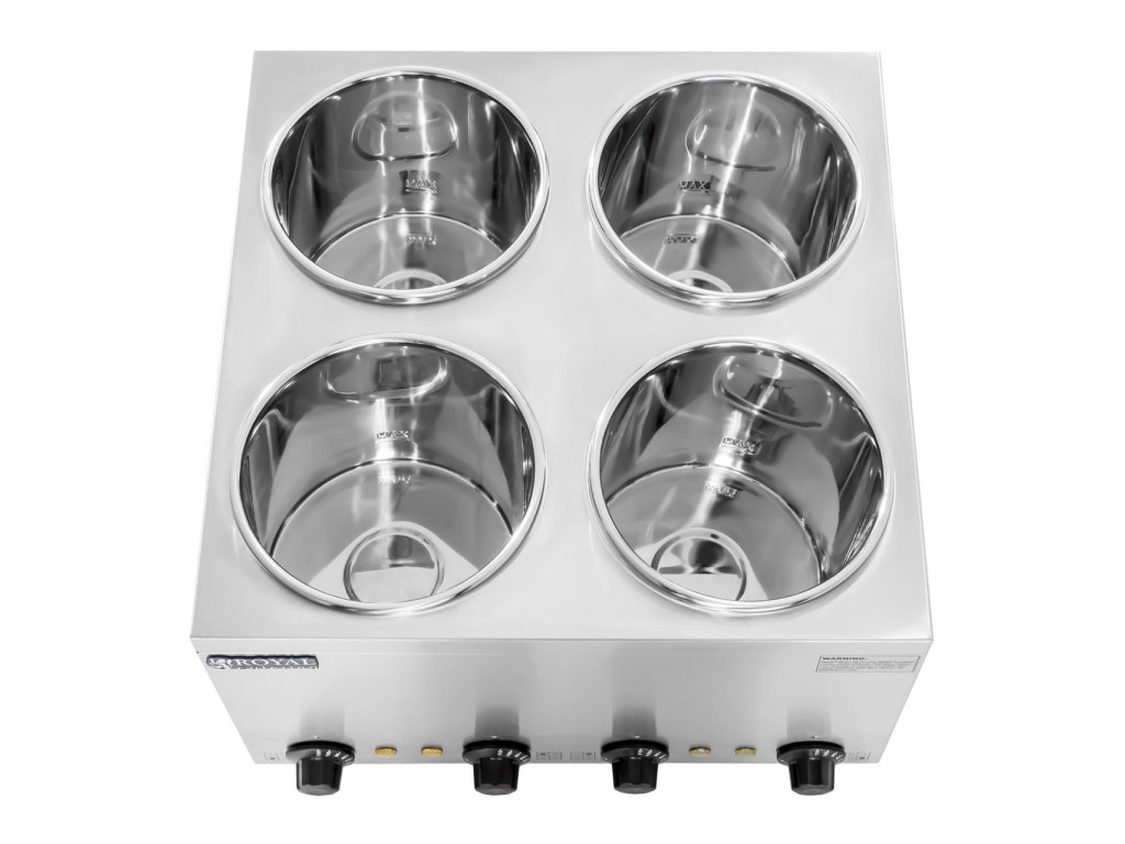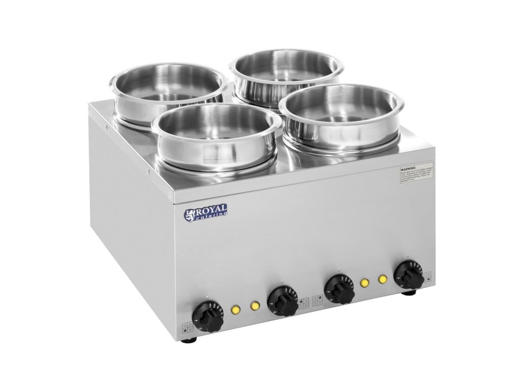 Obsah 4 vyjímatelných hrnců se šetrně ohřívá ve vodní lázni. K tomu se vodou naplní jednotlivě vyhřívané a ohřívatelné tanky. Maximální kapacita vody je 0,6 L. Na čtyrech regulátorech lze nastavit teplotu v rozmezí mezi 30 - 110 ° C. Díky vysokému rozpětí teplot je polévková stanice od Royal Catering vhodná nejen na udržování teploty, ale i na na fondue, nebo rozpouštění čokolády.