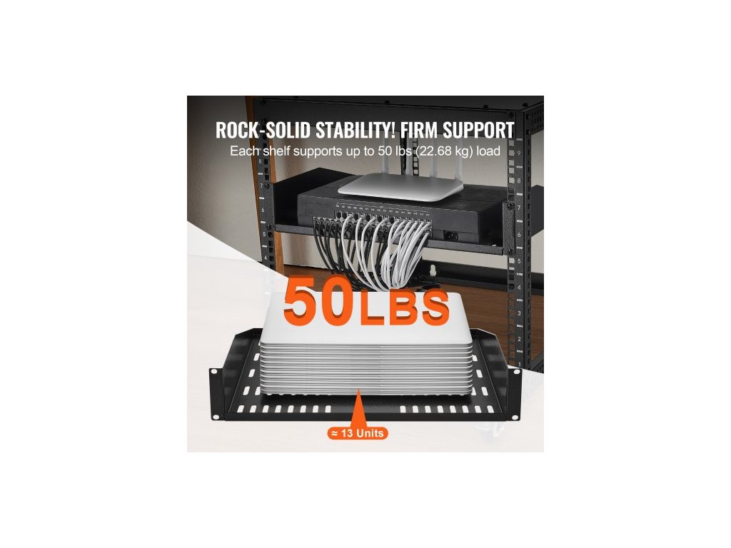 Police do serverového racku 2U, hloubka 16"/406 mm, maximální nosnost 23 kg / 50 lbs, odvětrávaná konzolová nebo nástěnná police do racku s přihrádkou, dobrá cirkulace vzduchu pro síťovou skříň nebo rackový systém o rozměrech 482,6 mm/19"