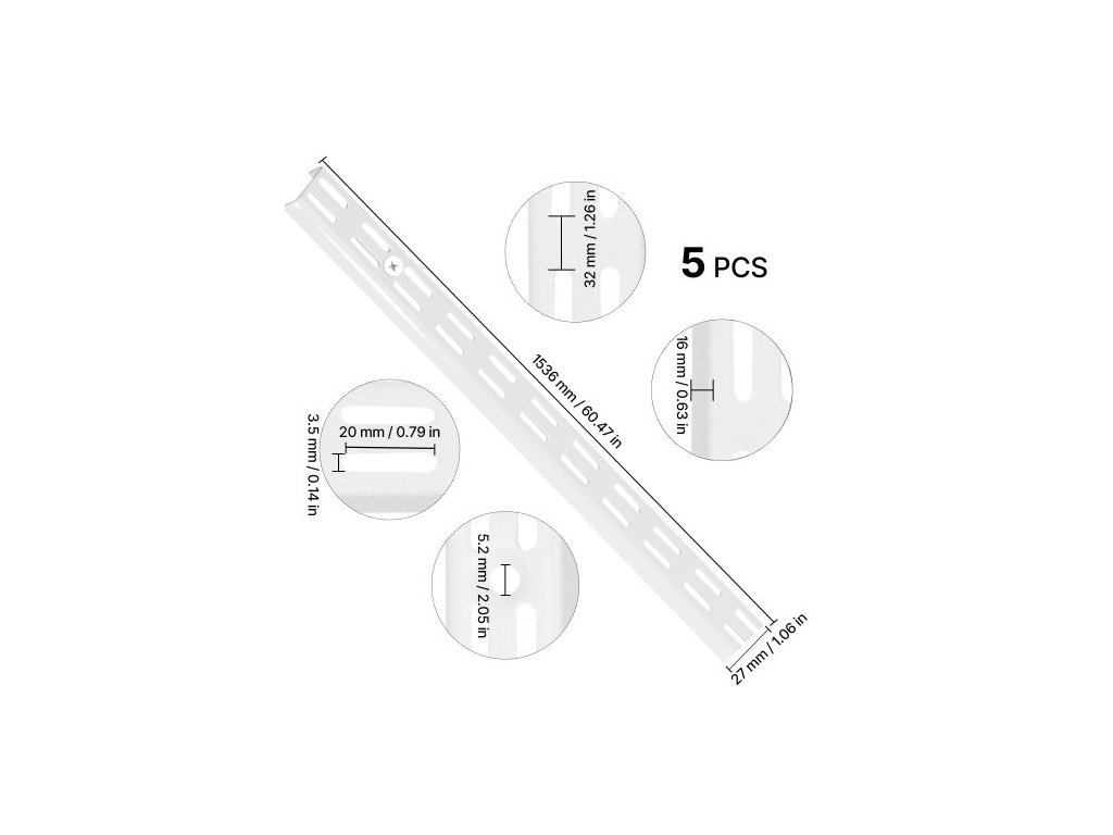 Policový pilastr , balení po 5 kusech, 60 palců, dvoukolejnicový svislý nástěnný policový systém, odolný podpůrný systém s dvojitými drážkami, 25 šroubů, vhodné pro organizaci úložného prostoru ve skříních, stříbrná