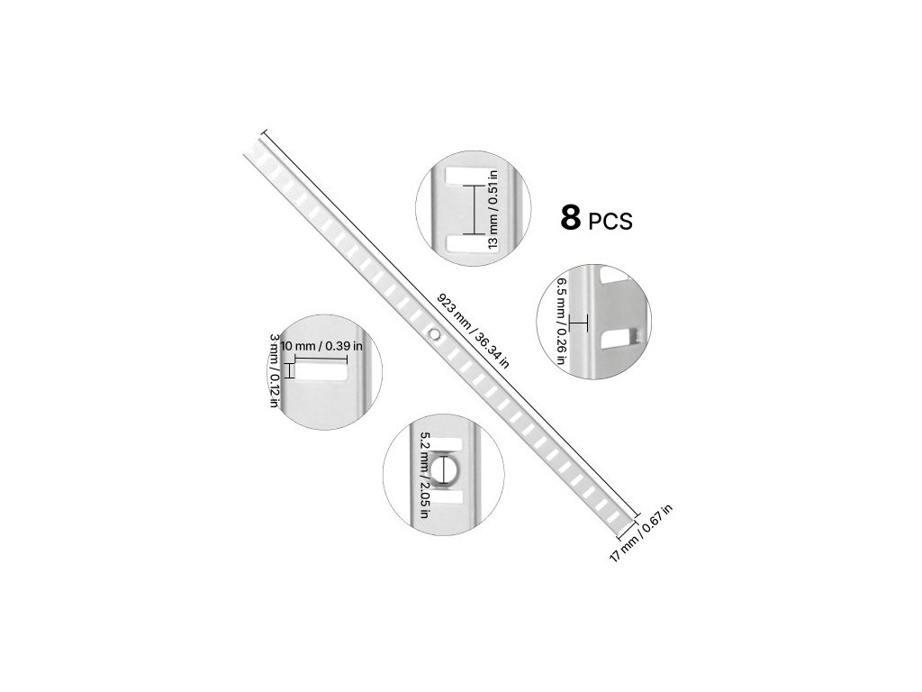 Policový pilastr , balení po 8 kusech, nastavitelné konzole na police, ocelové zárubně, pilastrové lišty s 32 šrouby, vhodné pro nástěnné policové systémy, organizaci skříní a šatních skříní